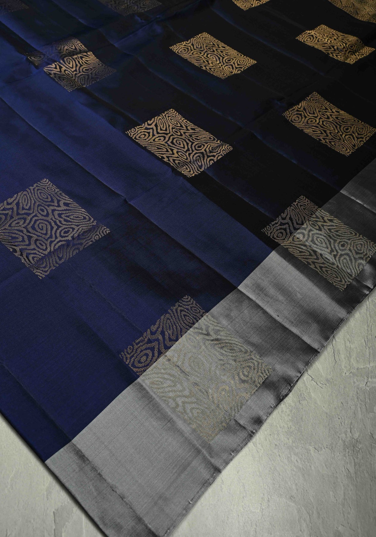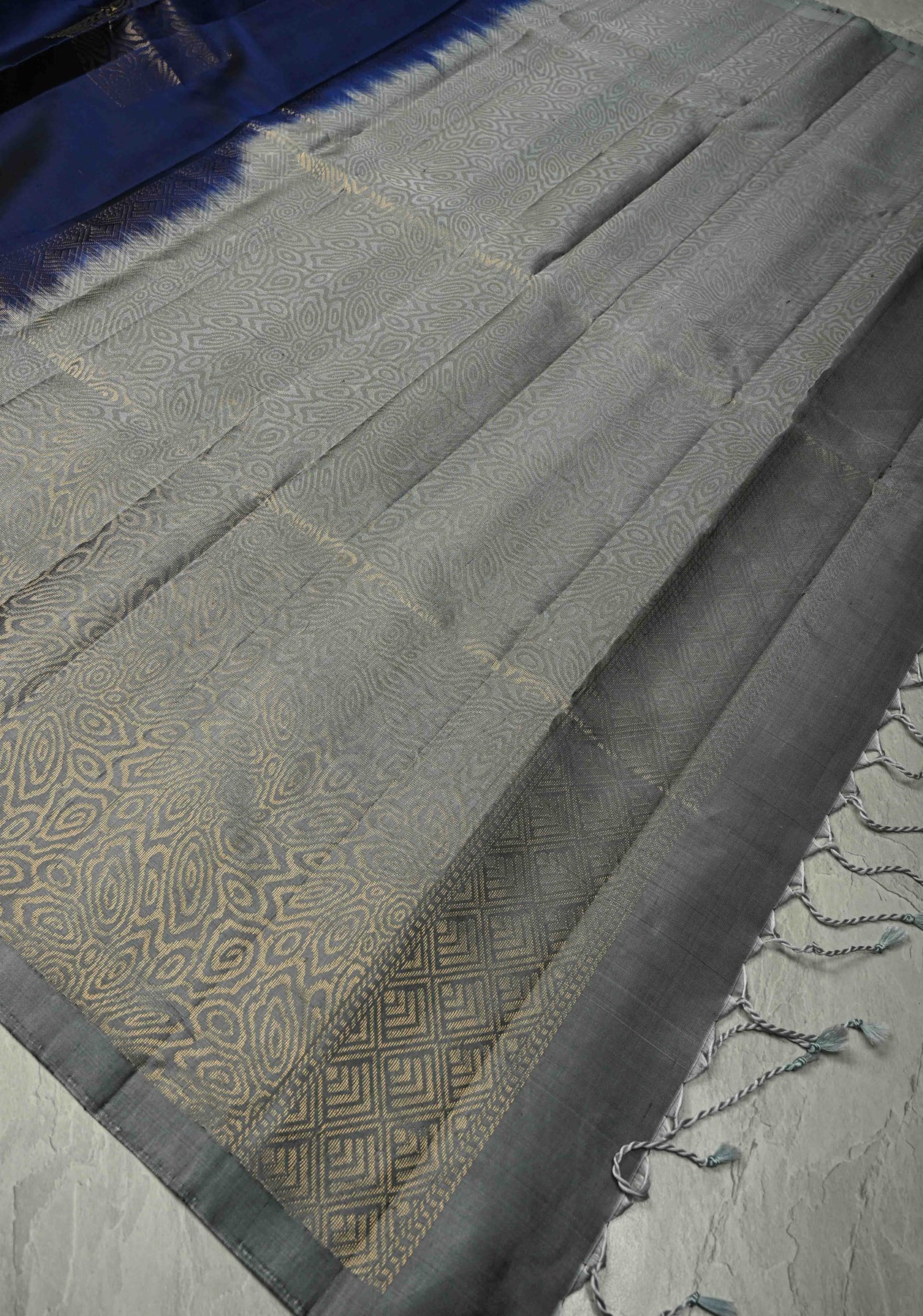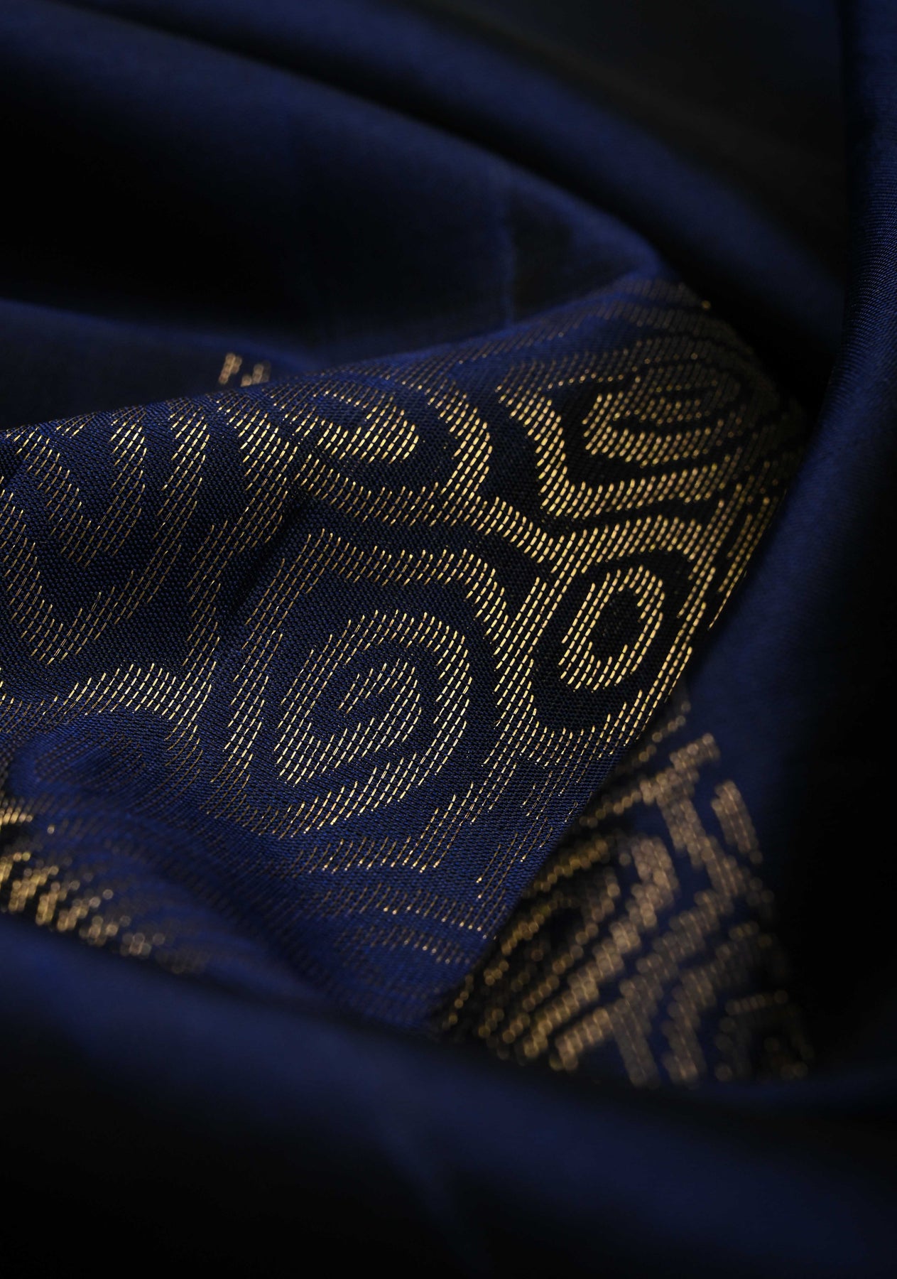 Immerse yourself in refined with this Navy Blue Kanjivaram Soft Silk Saree, a stunning blend of tradition and contemporary elegance. The serene stratos blue hue offers a calm yet majestic appeal, making it an elegant choice for any grand celebration.