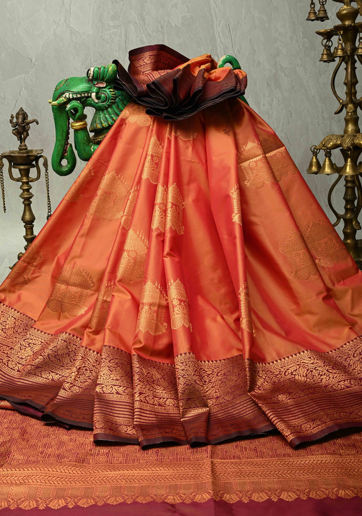 Pastel Orange Dual Tone Kanchi Semi Silk Saree with Zari Buttas and Contrast Wide Zari Border