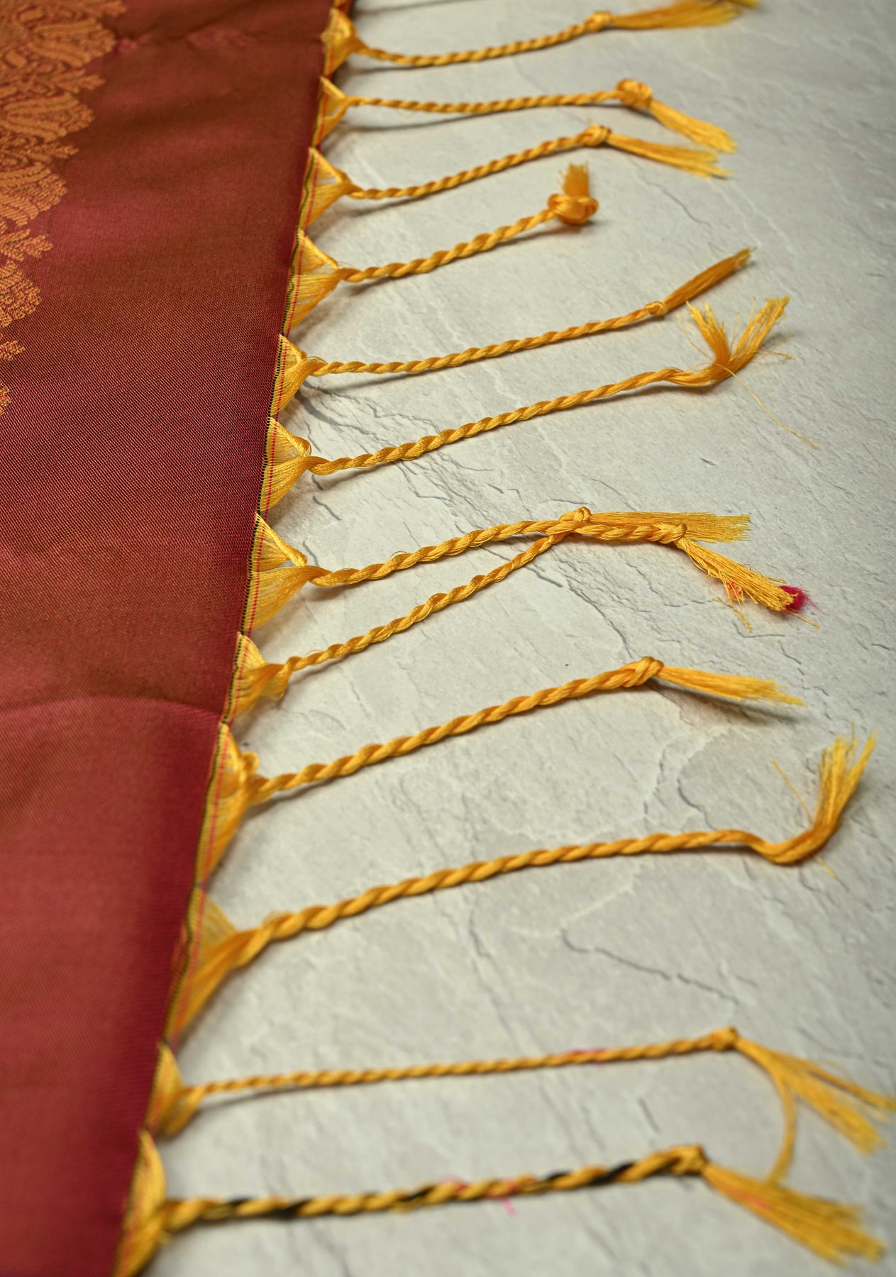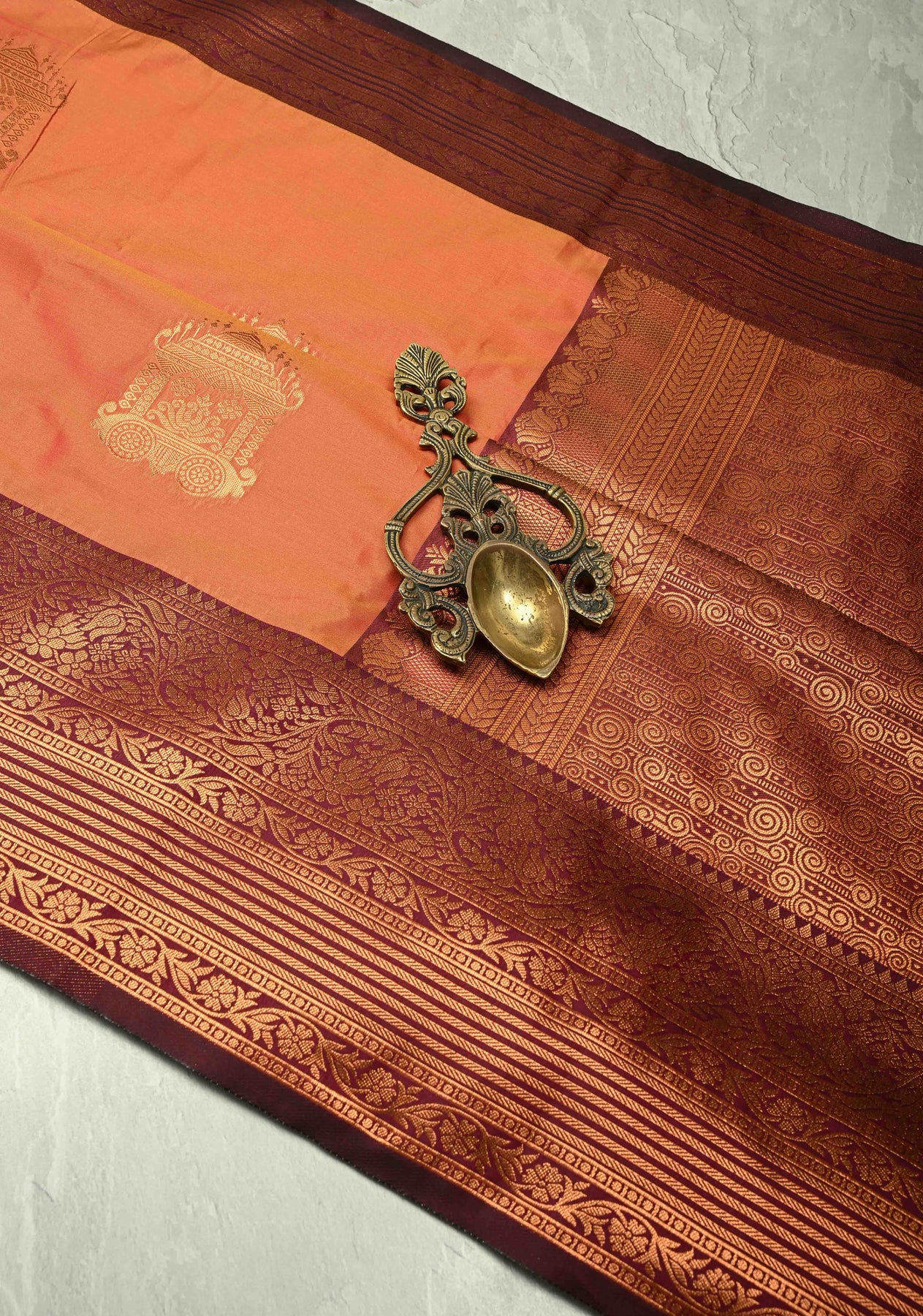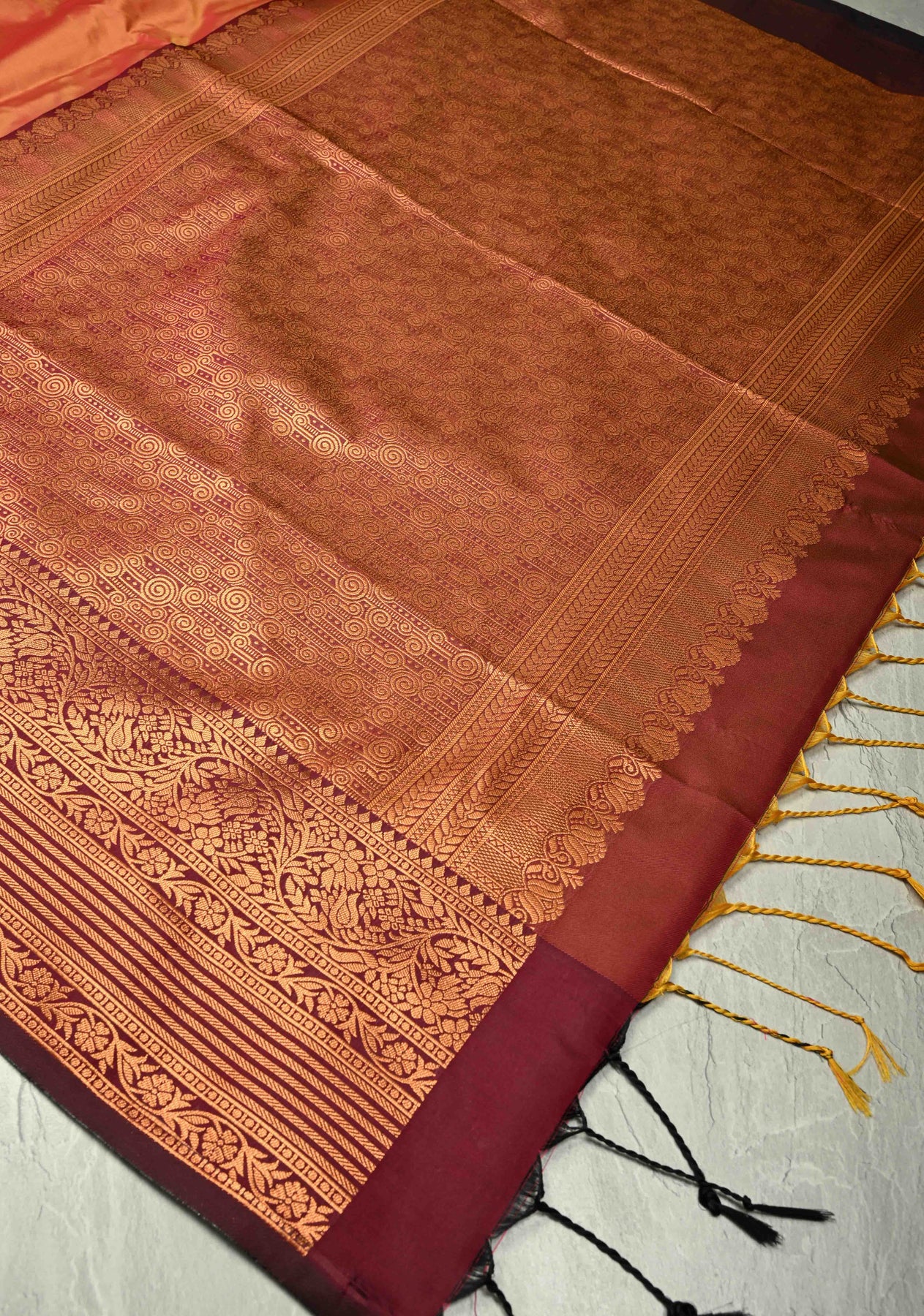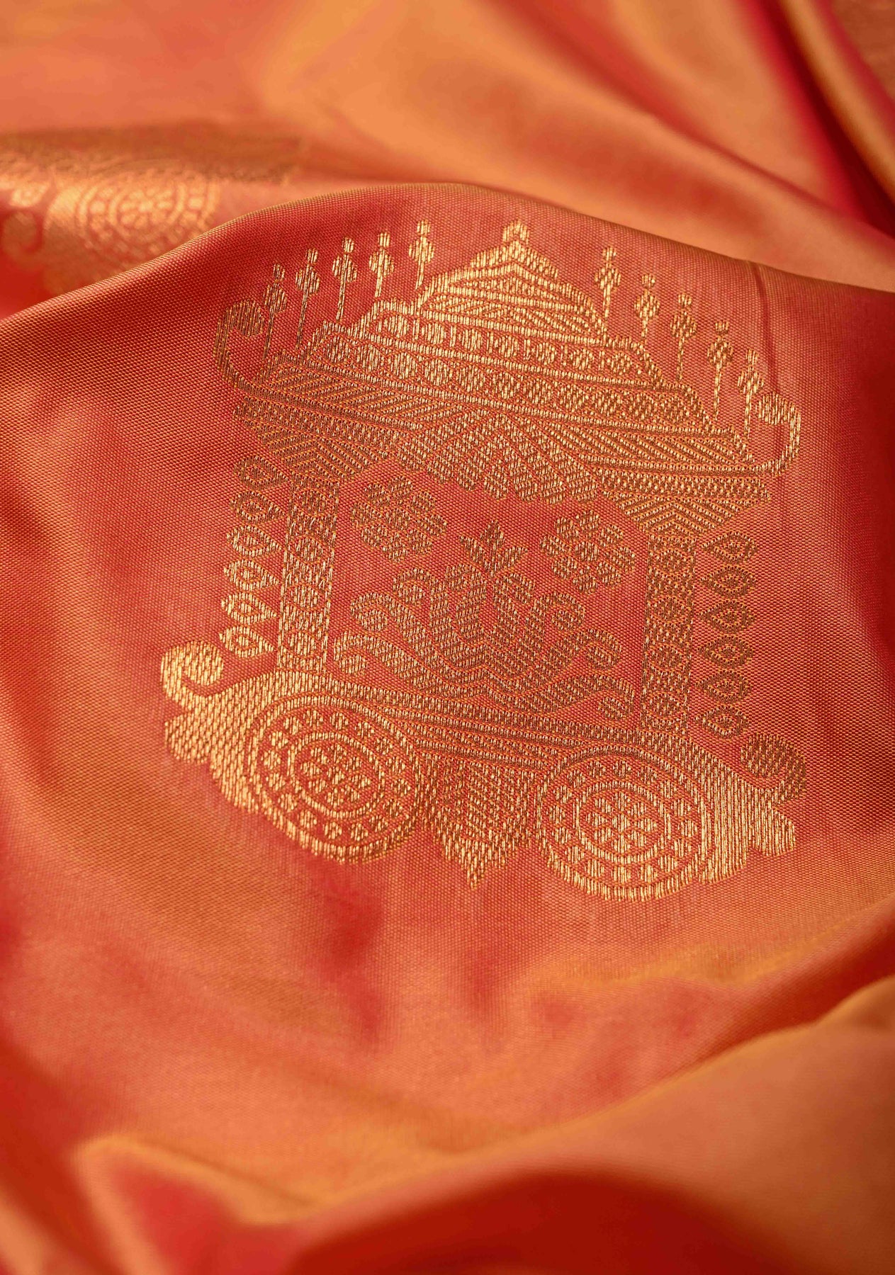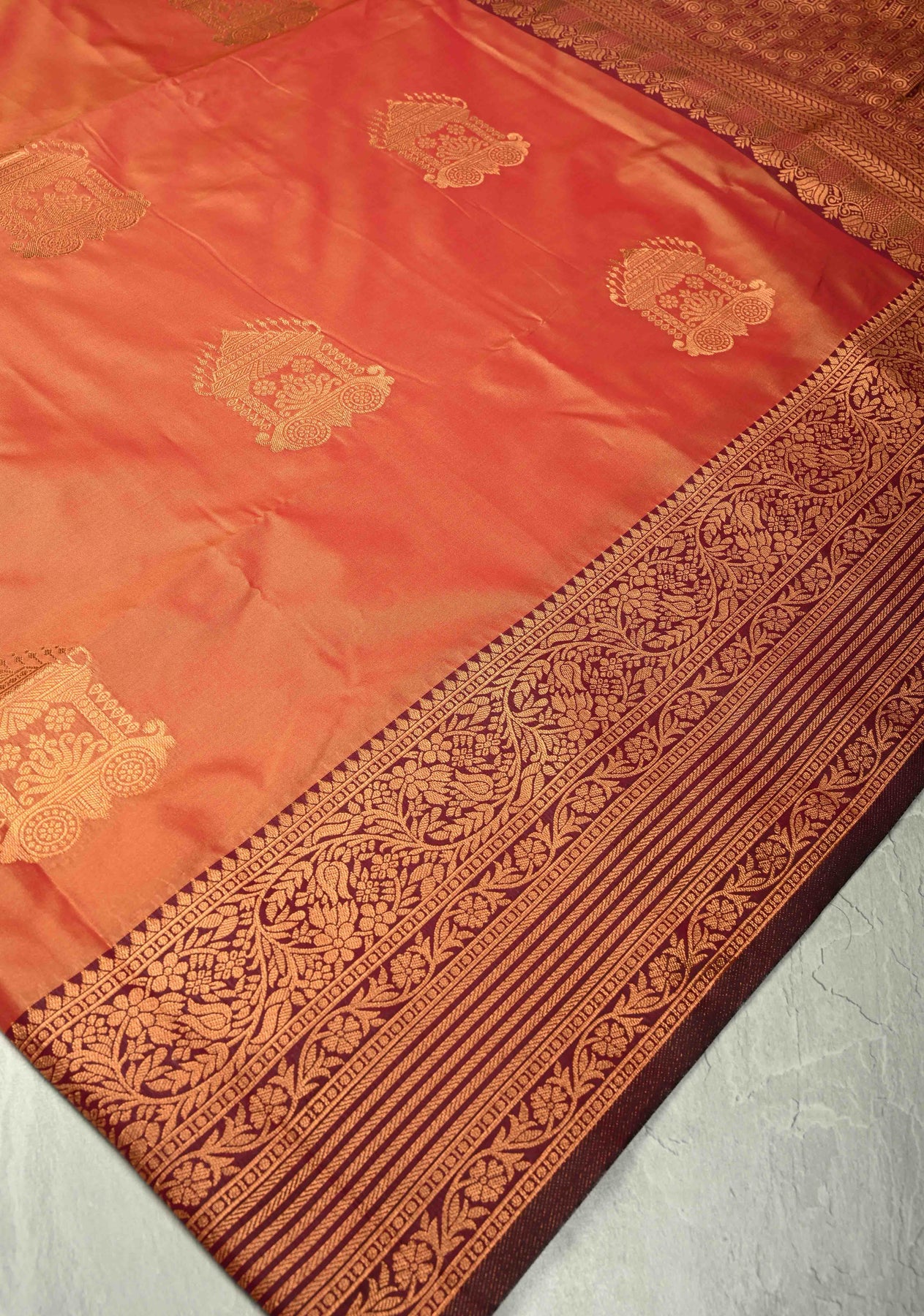 Pastel Orange Dual Tone Kanchi Semi Silk Saree with Zari Buttas  and Contrast Wide Zari Border