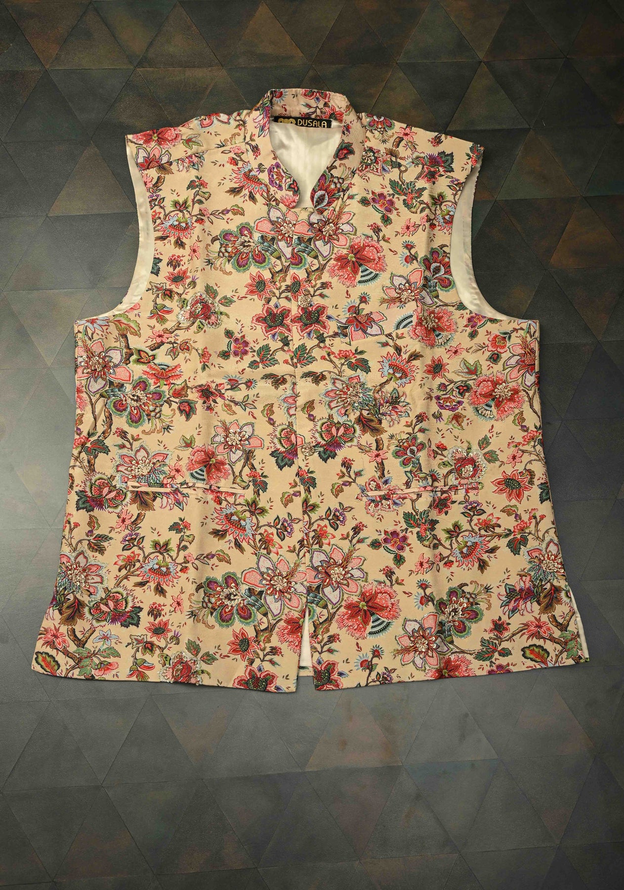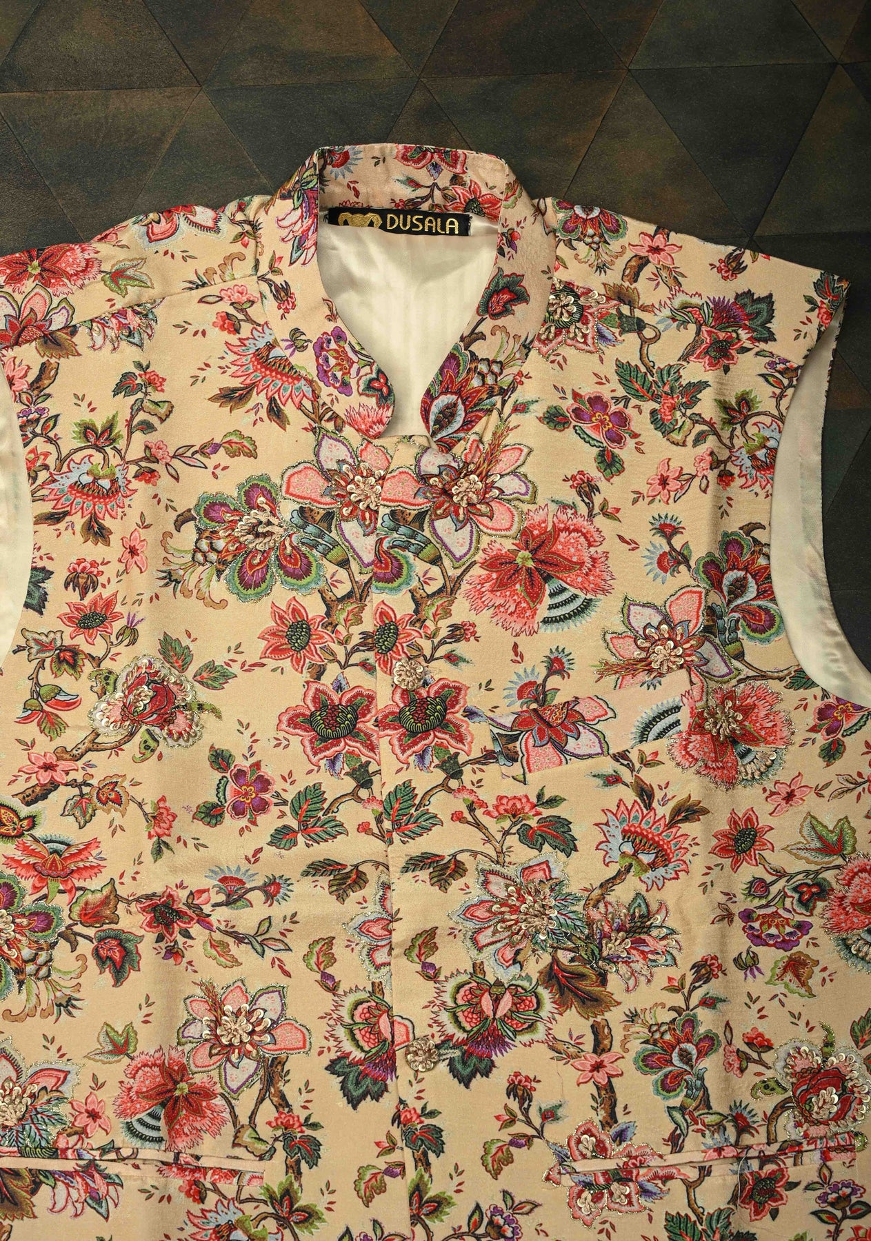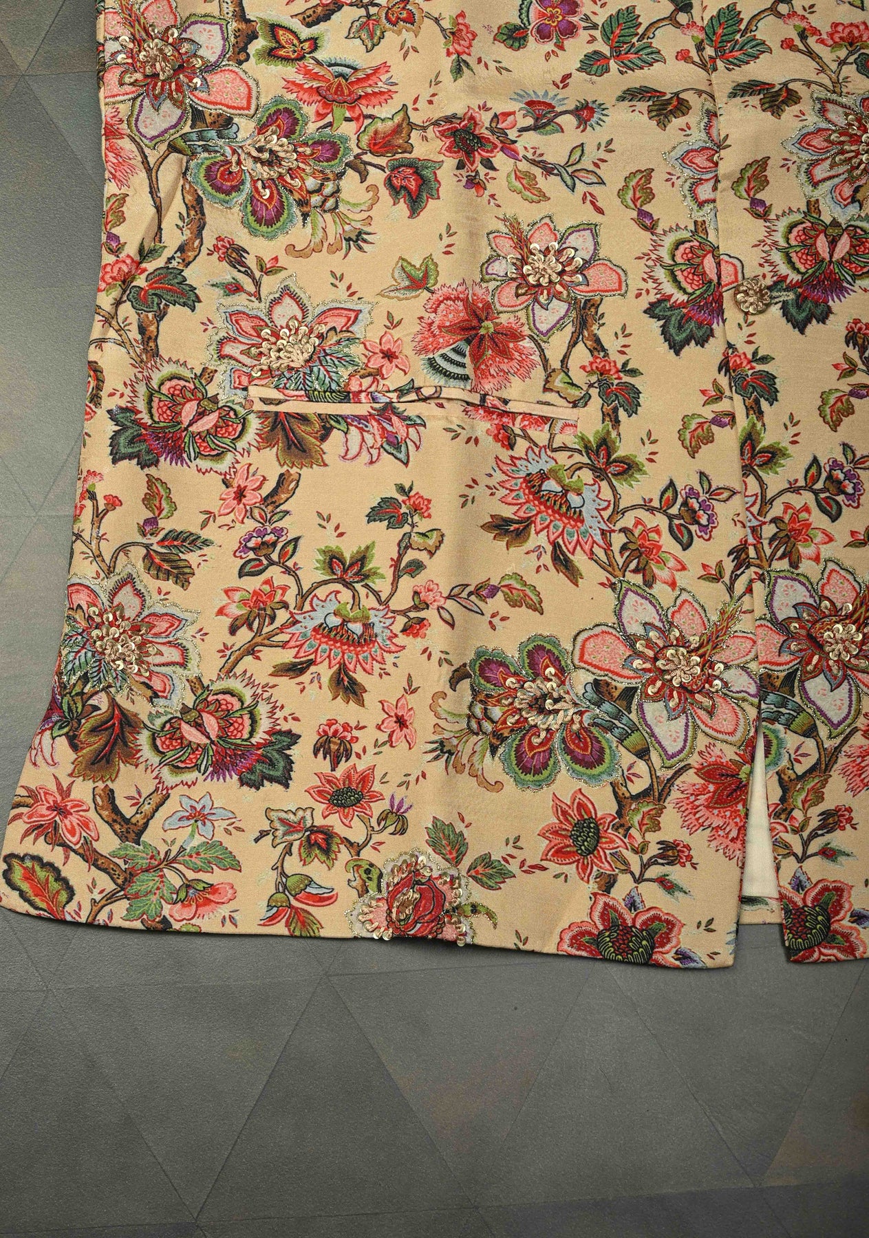 The Peach Floral Digital Print Bandhgala Silk Full Jacket for Men is a sophisticated blend of modern style and traditional craftsmanship. Made from silk, this jacket features a soft and elegant peach base that beautifully highlights the vibrant floral digital print, giving it a refined yet contemporary appeal. The design is further elevated with exquisite thread and sequins hand embroidery, adding texture, depth, and a subtle sparkle that enhances the overall richness of the piece. Tailored in a classic bandhgala silhouette, this full jacket offers a regal and polished look, perfect for weddings, festive celebrations, and formal occasions. It serves as a standout statement outfit for men who appreciate fine detailing and timeless elegance.
