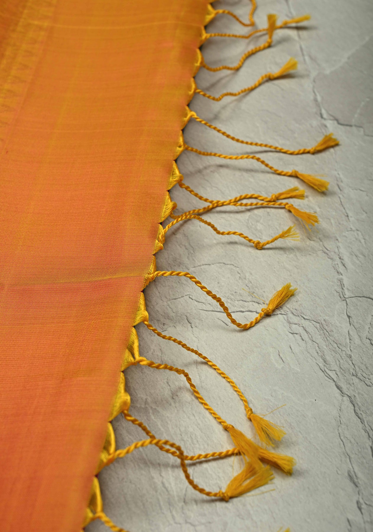 This saree is ready to wear with fall and pico done. Handmade silk tassels as seen in the pic adorn the pallu and add more grace to it. An unstitched blouse fabric is included.