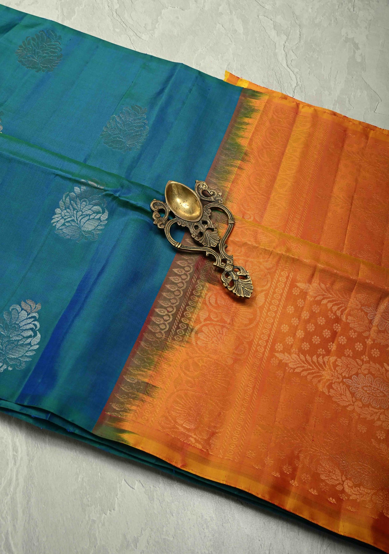 Graceful and regal, this Peacock Blue Dual-Tone Borderless Kanjivaram Soft Silk Saree is a modern take on a timeless classic. Woven in soft silk with a dual-tone sheen, the saree features elegant gold and silver buttas scattered across the body, adding a refined shimmer. Its sleek, borderless silhouette enhances the contemporary appeal, while the contrasting pallu provides a striking finish with traditional motifs and intricate detailing. Perfect for weddings, special occasions, or festive events, this saree effortlessly balances tradition with sophistication.