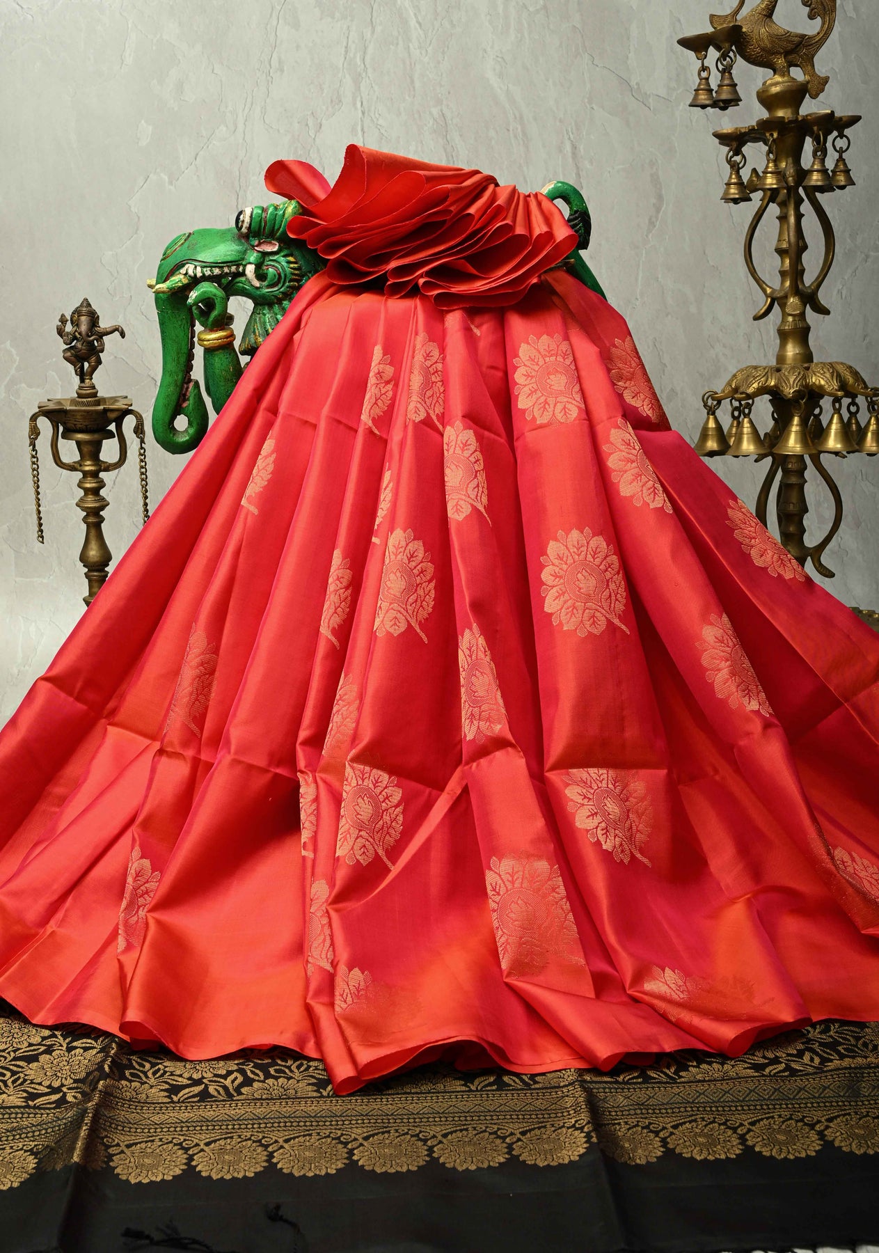 Its contrast pallu enhances the visual appeal, creating a striking drape without a traditional border, making it ideal for contemporary ethnic styling. Crafted from soft silk, this saree offers a smooth texture, graceful fall, and lightweight comfort. Perfect for weddings, festive occasions, and cultural celebrations, it’s a timeless piece that blends heritage craftsmanship with modern elegance.