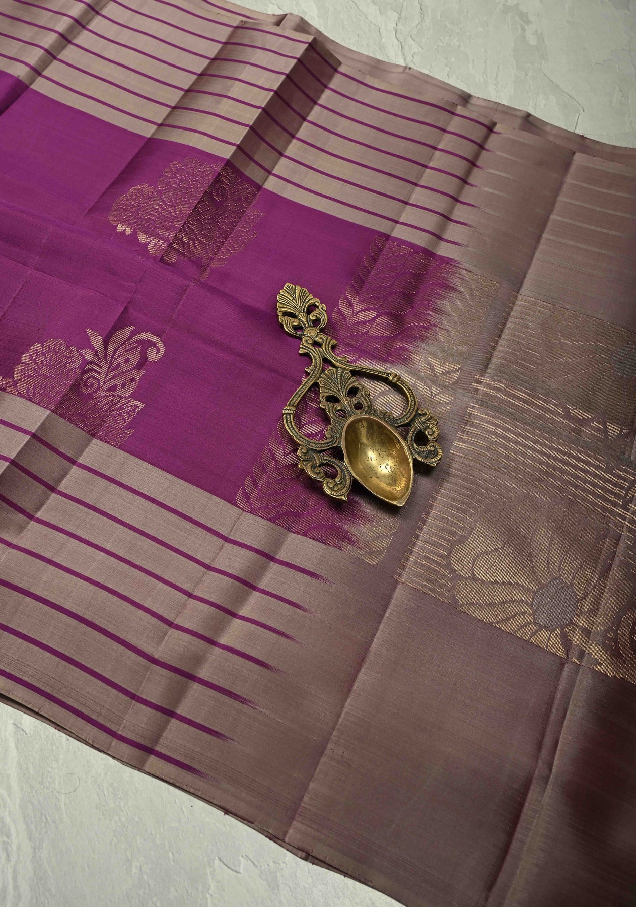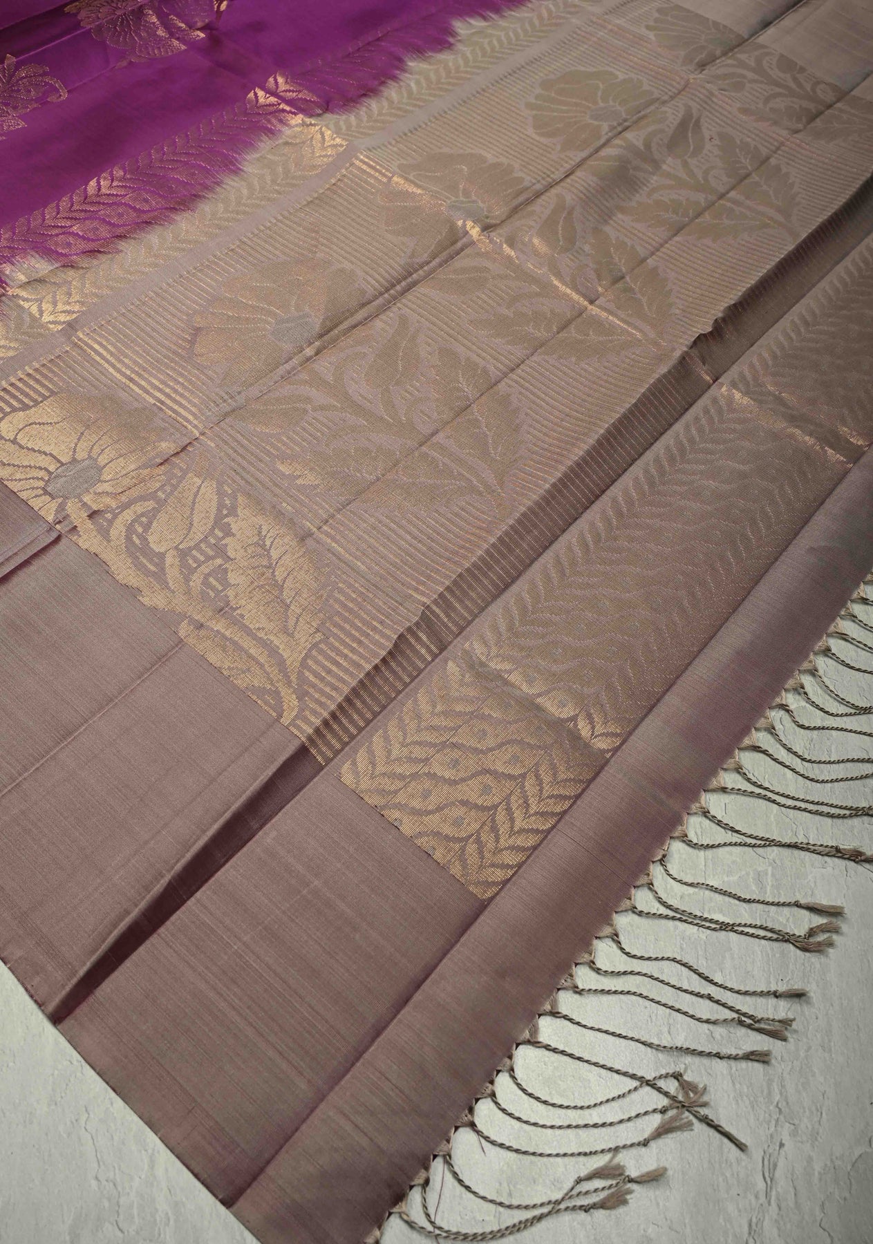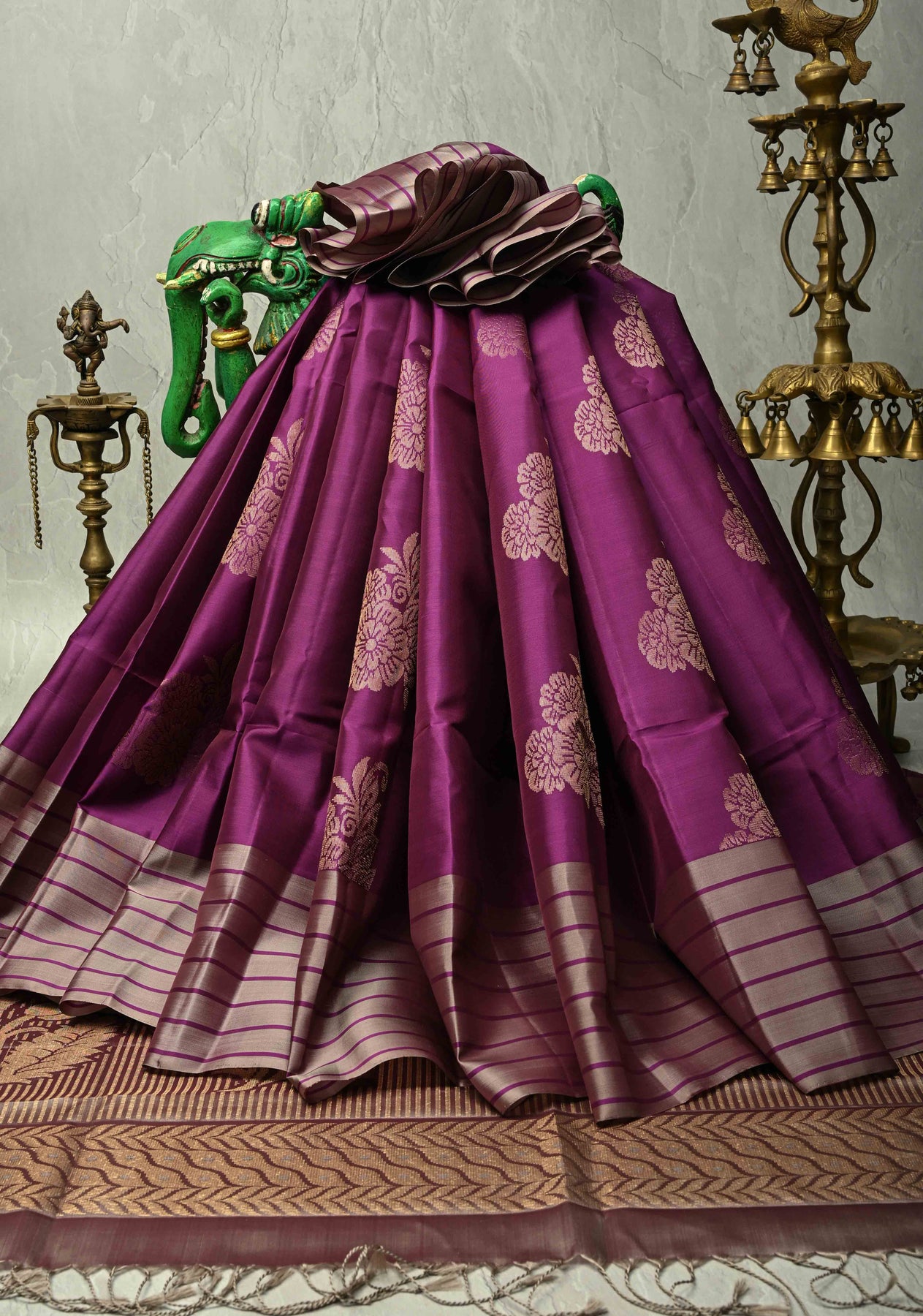 Plum Kanjivaram Soft Silk Saree with Floral Zari Buttas and Contrast Border | SILK MARK CERTIFIED