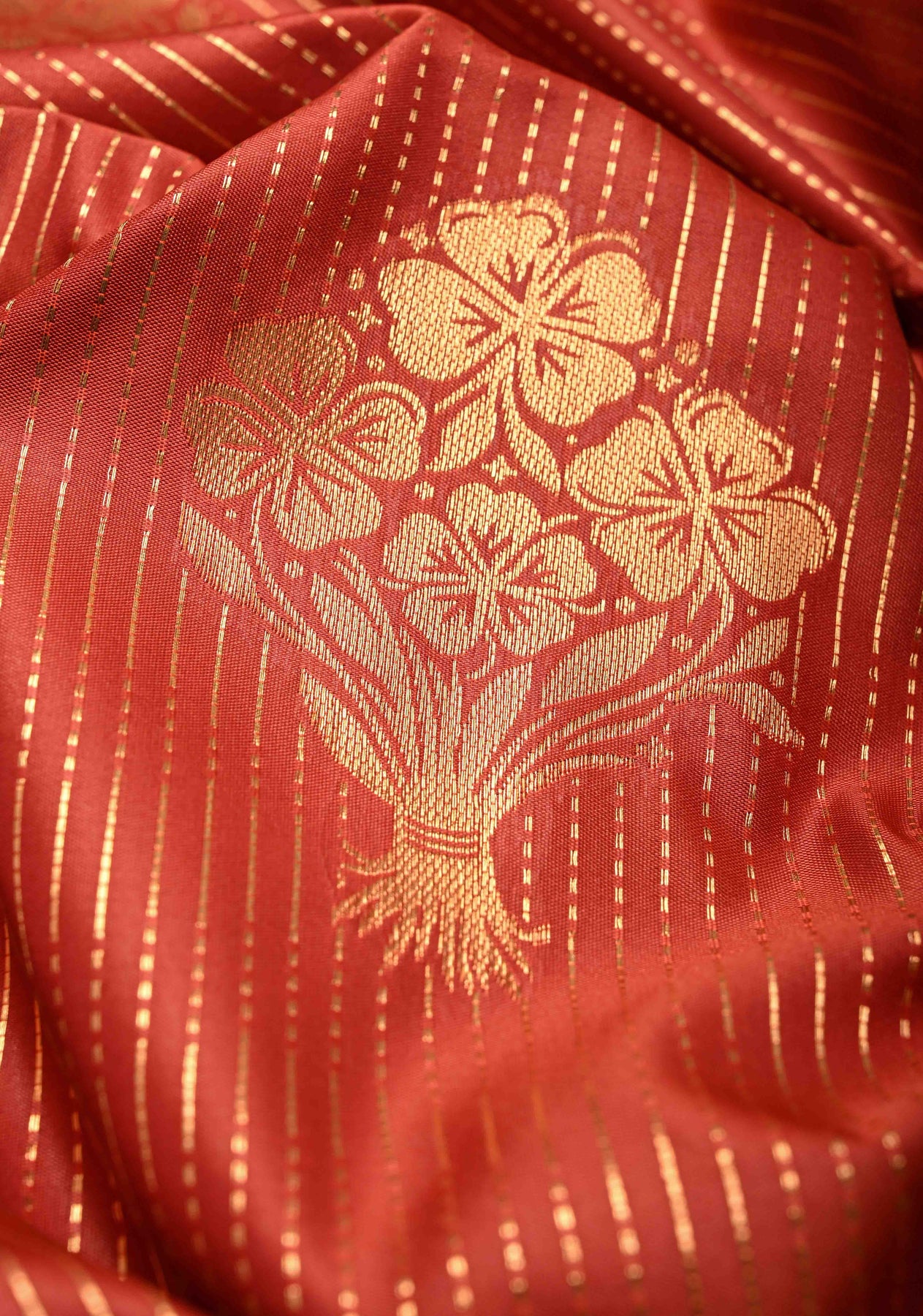 Elevate your festive wardrobe with this exquisite Pumpkin Orange Dual Tone Kanchi Semi Silk Saree. Featuring elegant vertical stripes that create a dual-tone effect, the saree glows beautifully with every movement. Intricate zari buttas add subtle sparkle across the body, enhancing its traditional charm. The contrasting zari border lends a striking finish, highlighting the saree’s vibrant color and timeless appeal. Lightweight, smooth, and graceful to drape, this saree is perfect for weddings, festivals, and cultural celebrations—where elegance meets tradition in every fold.