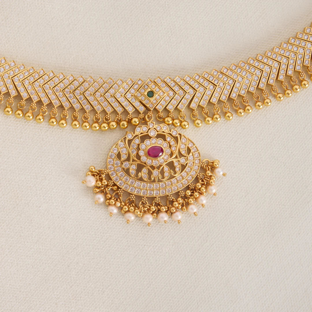 Aarshvi Flow Short Necklace showcases expert craftsmanship, featuring a delicate Floral design. Adorned with sparkling Cubic Zirconia stones and vibrant Rubies, it exudes refined elegance. The necklace is further enhanced by graceful hangings of Pearls and Golden beads, adding depth and movement to its luxurious appeal. Perfect for those seeking a sophisticated statement piece that blends traditional artistry with exquisite detailing.