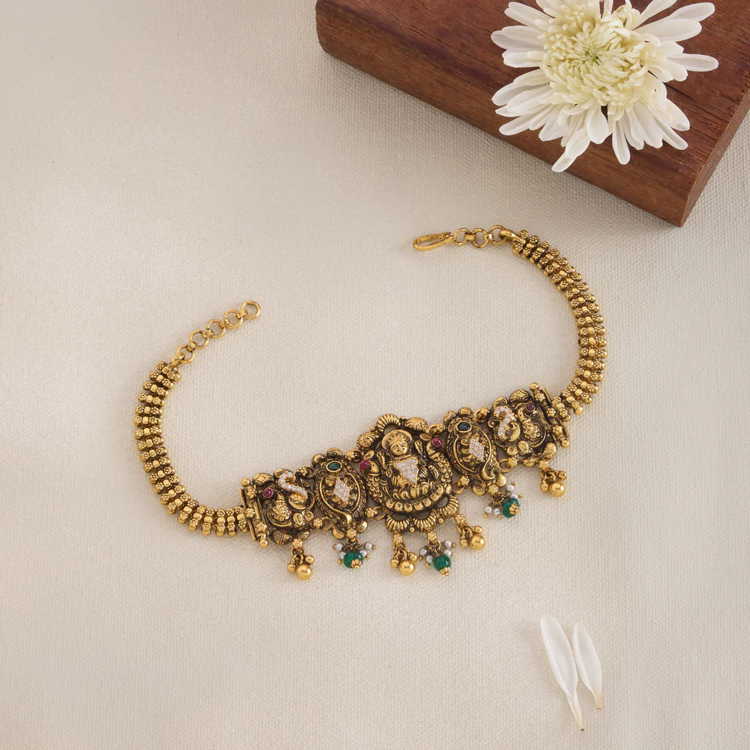 The Devi Shakti Choker showcases intricate Lakshmi and Peacock motifs, adorned with sparkling CZ stones and vibrant Rubies. Enhanced by Emerald and Golden bead hangings, this piece balances traditional craftsmanship with elegant detailing, making it perfect for festive occasions and cultural celebrations.