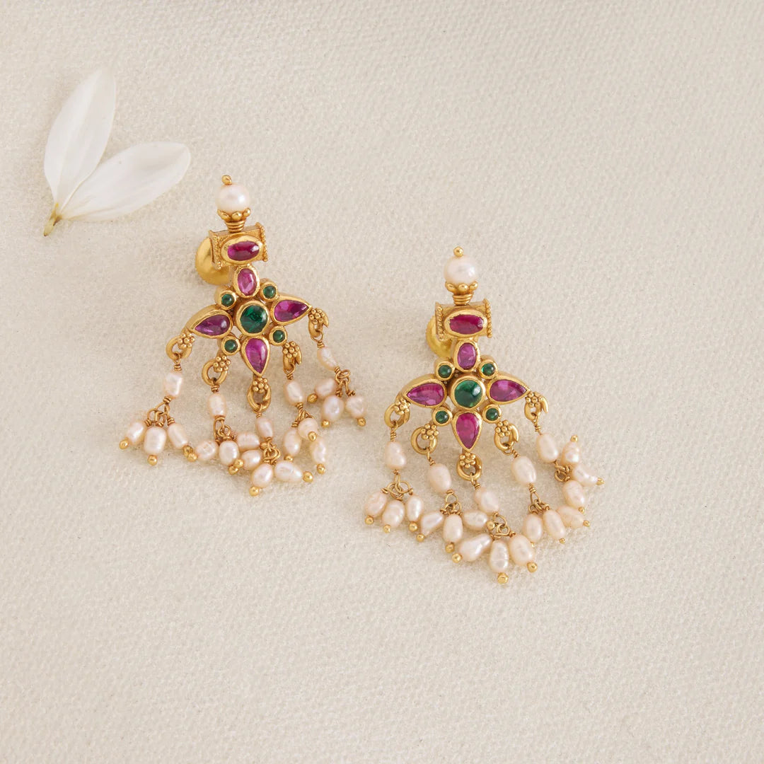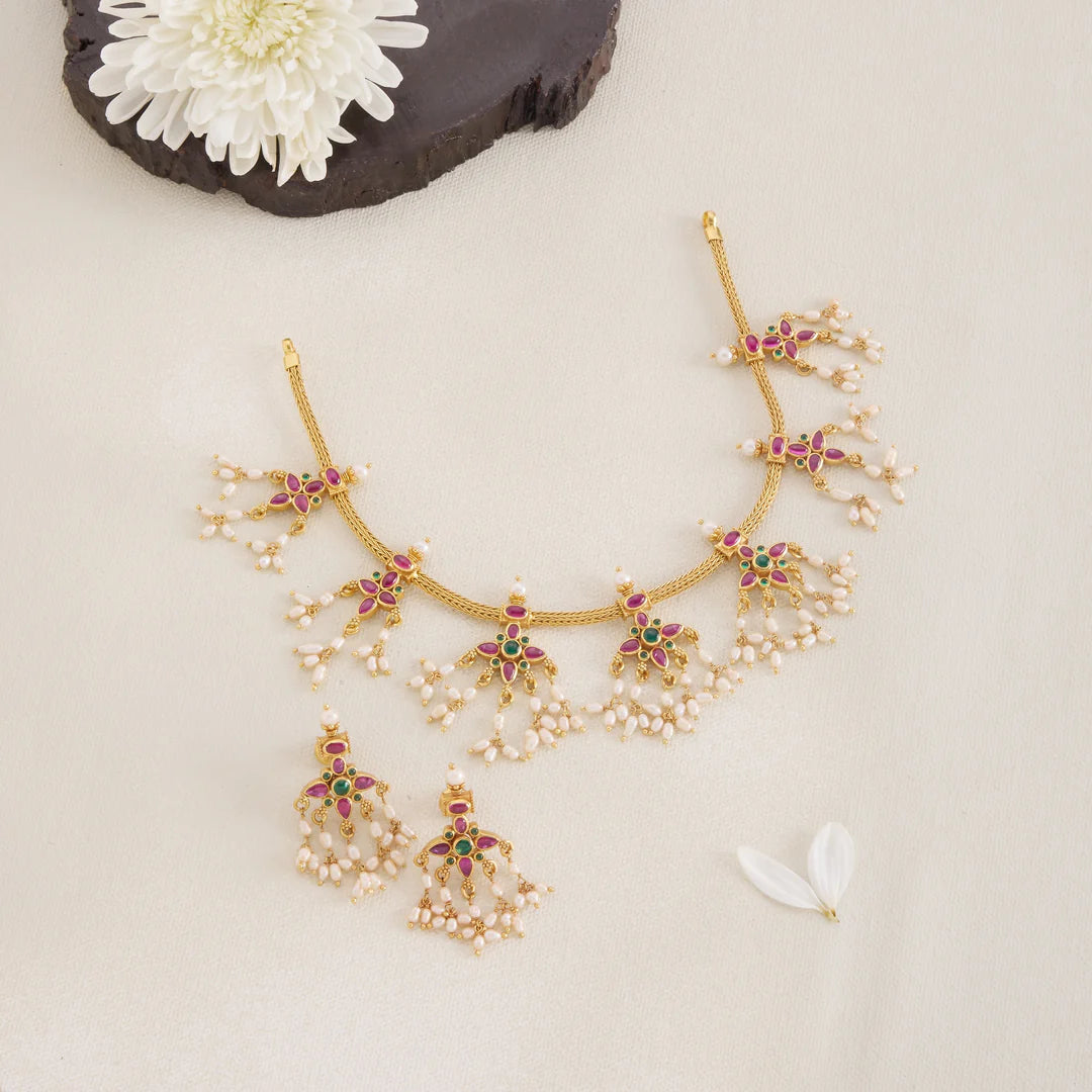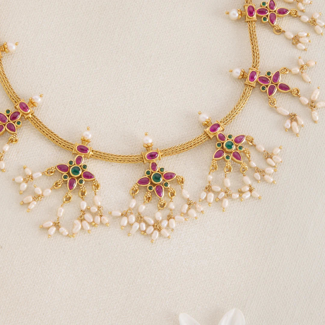 Devina Pasalu Necklace Set showcases exquisite craftsmanship with intricate Floral Motifs, beautifully accented by Emeralds and Rubies. Pearls delicately enhance the design, adding a timeless elegance. This set combines traditional artistry with vibrant gemstones, making it an exceptional choice for special occasions and connoisseurs of jewellery.