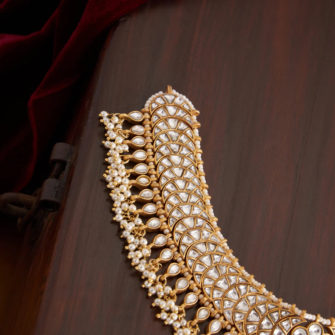 This stunning Kundan Kalakriti design features Kundan and Pearl details, seamlessly set with invisible setting. Expertly crafted, this piece showcases the perfect fusion of traditional elegance and modern design. Elevate any outfit with this unique and versatile accessory.