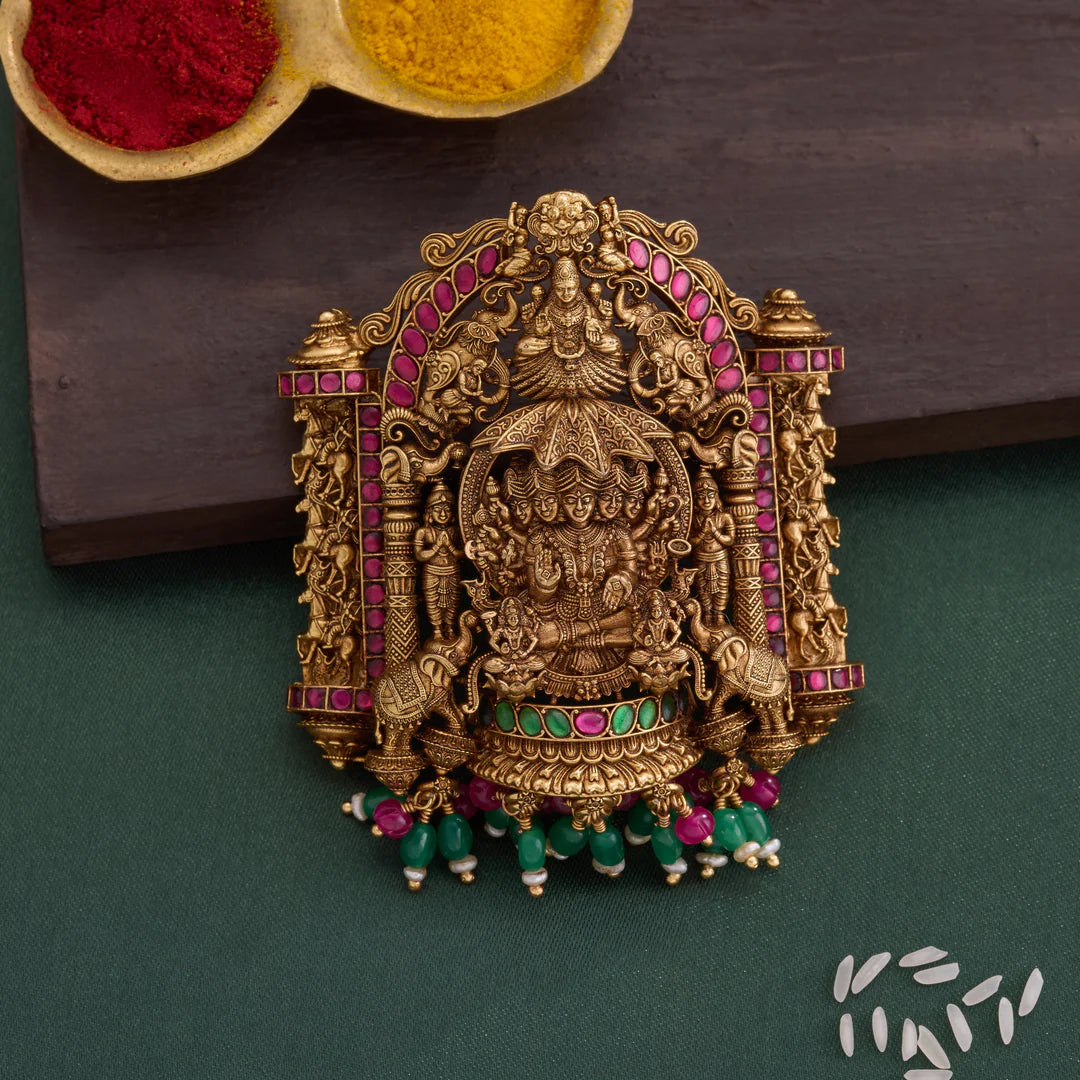 The Mandahasini Lakshmi Pendant is exquisitely crafted featuring the Goddess Lakshmi, symbolizing prosperity and abundance. Adorned with vibrant Emerald and Ruby hangings, this pendant blends traditional artistry with striking colour contrast, enhancing its divine elegance. Perfect for adding a touch of spiritual grace and sophistication to any ensemble.