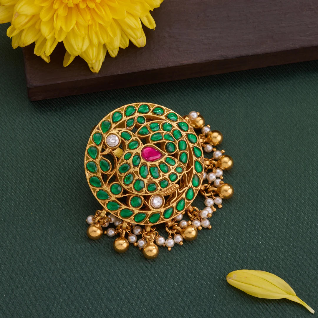 The Mayuraharini Pendant is an exquisite piece crafted with intricate Peacock motifs, embellished with sparkling Kundan stones. Accentuated by elegant Golden bead hangings and lustrous Pearls, this pendant combines traditional artistry with refined detailing, making it a distinguished accessory for any occasion..