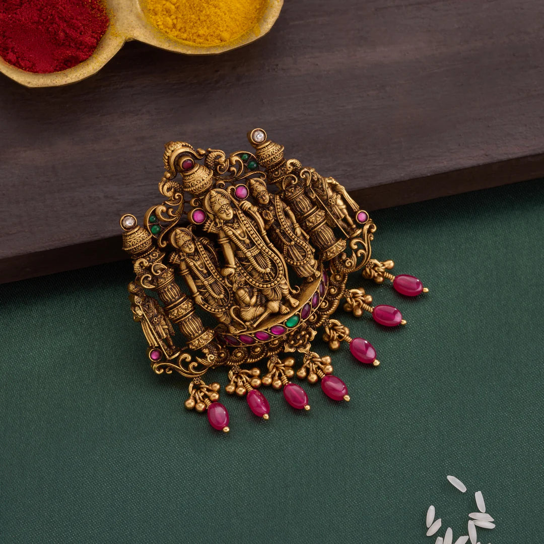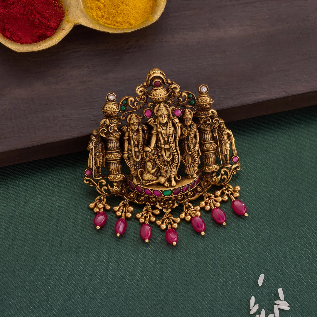 The Parivar Darpan Pendant elegantly features the divine Ram Parivar motif, enhanced with Kundan setting. Accented by delicate Golden bead hangings, this piece seamlessly blends traditional symbolism with refined craftsmanship, making it a meaningful addition to your collection. Perfect for those who appreciate both heritage and artistry.