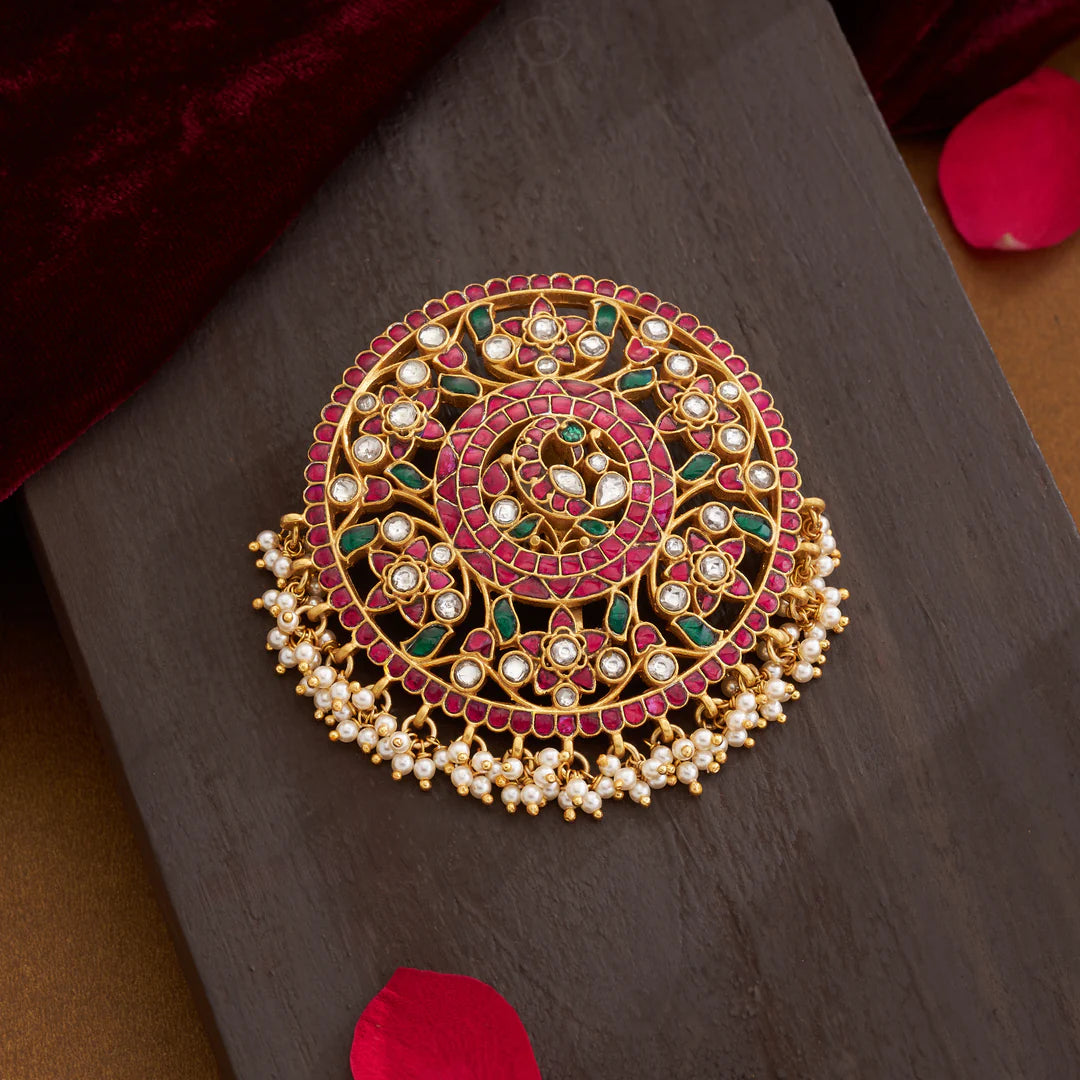 The Rajmayuri Kundan Pendant showcases exquisite craftsmanship with its intricate Floral and Peacock motifs. Adorned with traditional Kundan stones and elegant Pearl hangings, this pendant embodies timeless artistry. Perfect for enhancing ethnic outfits, it adds a refined touch of sophistication and cultural heritage to your jewellery collection.