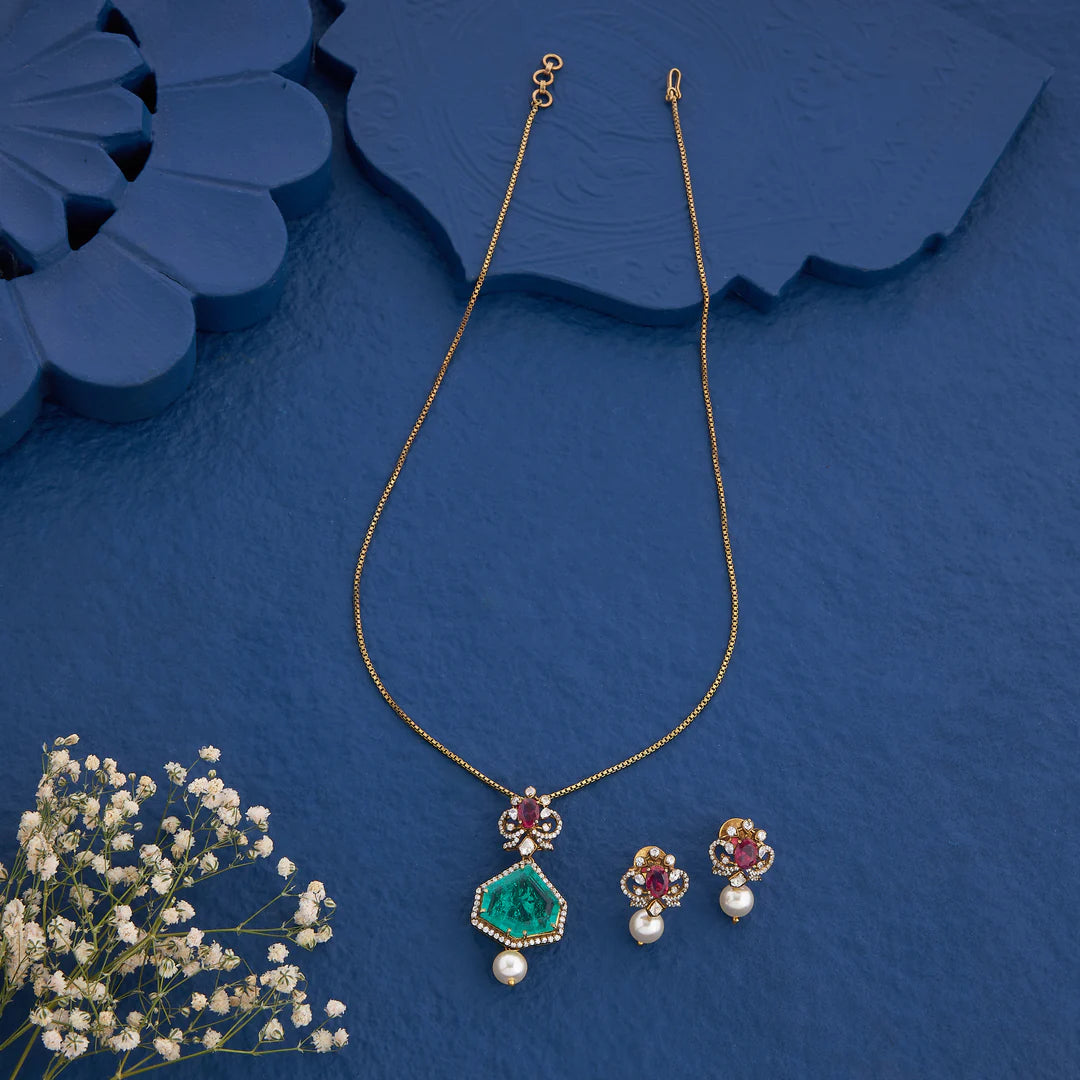 The Rosebud Grove Chain Pendant Set features a sophisticated blend of Emerald and Pink Tourmaline gemstones, perfectly accented with sparkling Cubic Zirconia and Moissanite stones. Graceful Pearl hangings add a delicate touch, creating an elegant piece that enhances any outfit with refined colour and timeless charm..