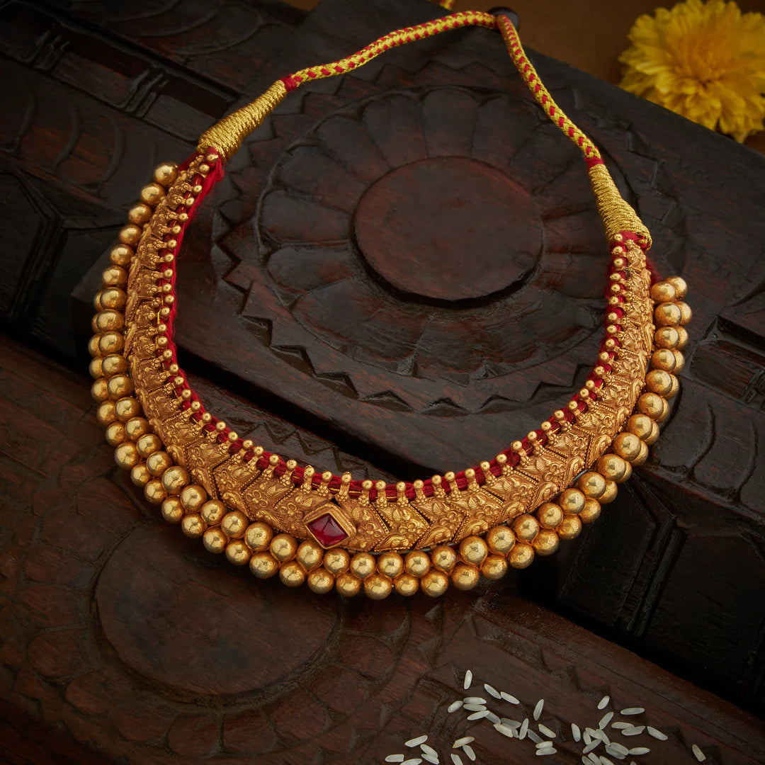 The Rudra Choker masterfully combines floral motifs with lustrous Ruby stones and elegant Golden beads. This expert design highlights intricate craftsmanship, making it a refined piece that enhances any ensemble with a touch of timeless beauty and sophistication.