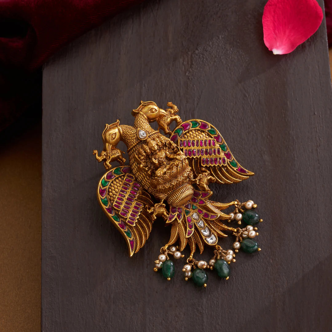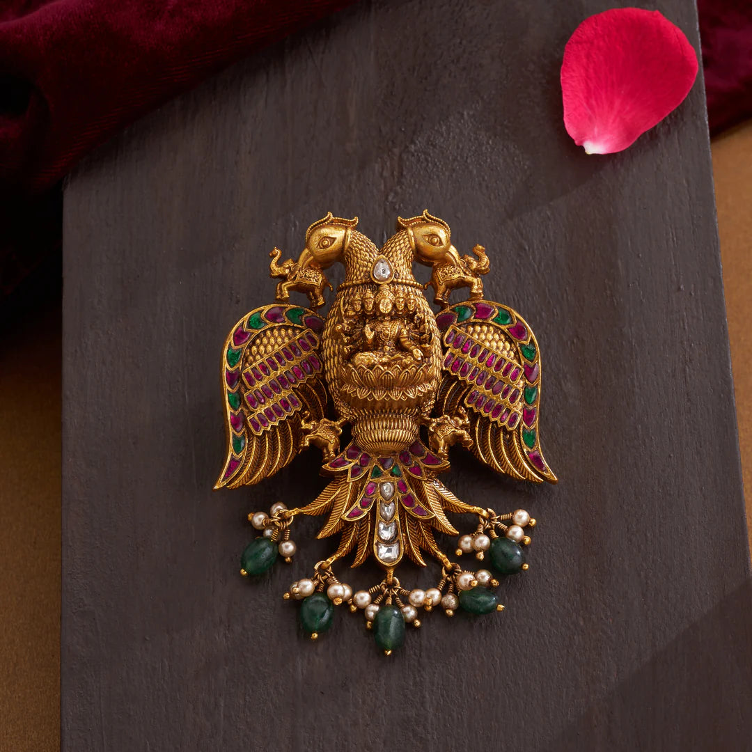The Shakti Paksha Pendant features a refined design combining the divine Lakshmi and the mythical Gandaberunda, enriched with elegant Elephant Motifs. Set with Kundan Emeralds and Rubies, it is complemented by graceful Emerald and Pearl hangings, reflecting expert craftsmanship and deep symbolic meaning in a sophisticated, timeless piece.