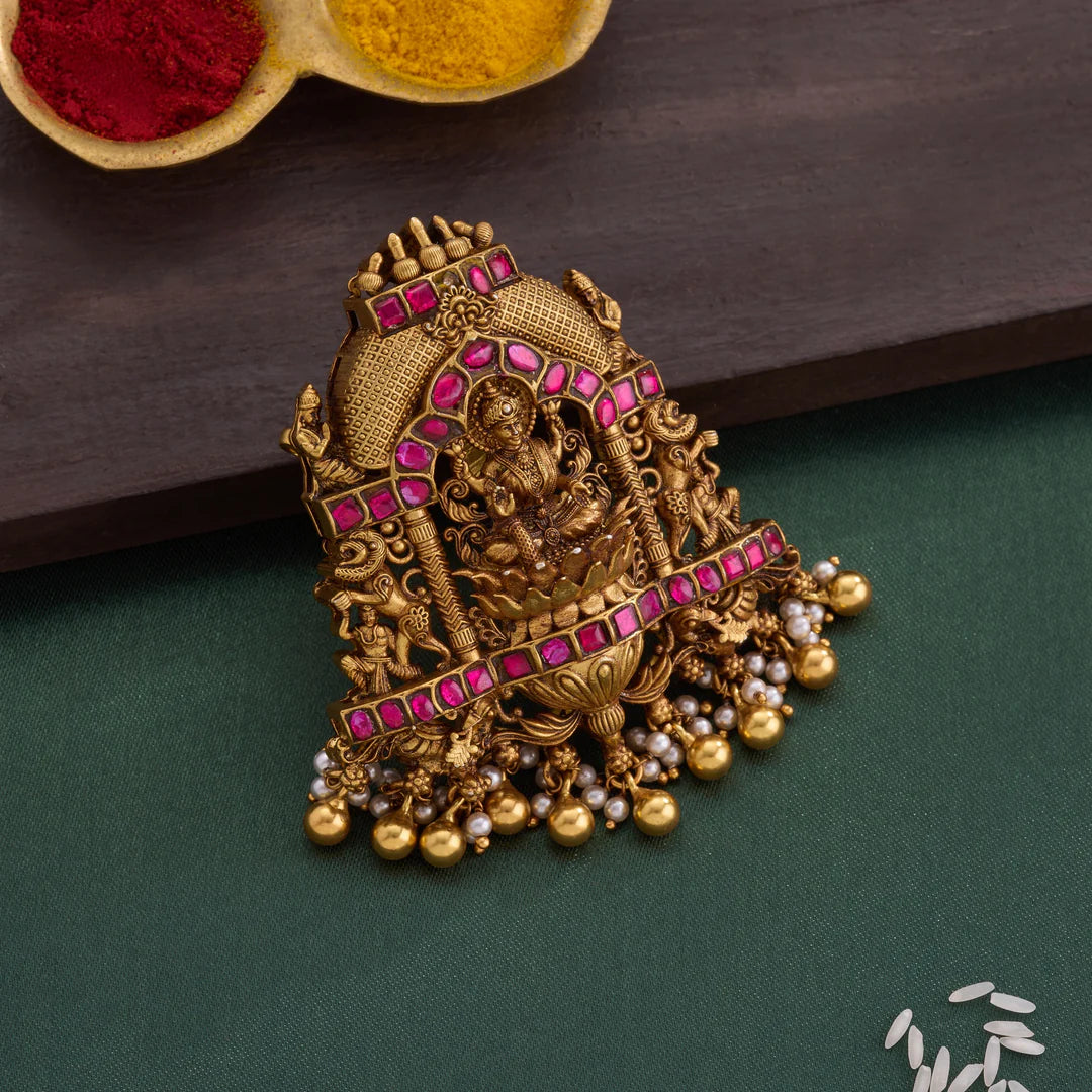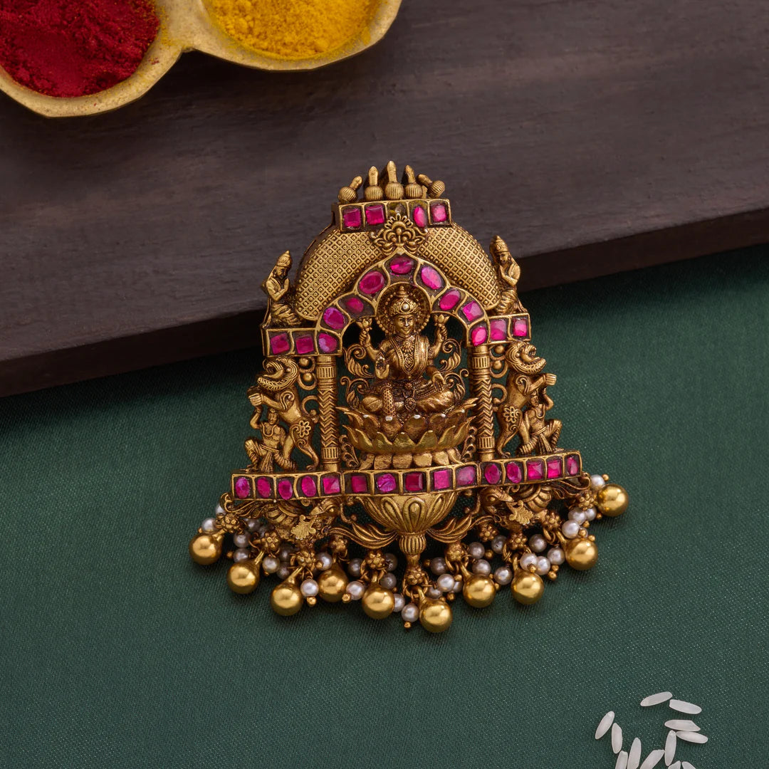 The Sukha Mandalasini Pendant features an exquisite Lakshmi motif adorned with vibrant Rubies, complemented by elegant Golden beads and delicate Pearl hangings. This intricate design blends traditional symbolism with refined craftsmanship, making it a distinguished statement piece that enhances both spiritual and aesthetic appeal.