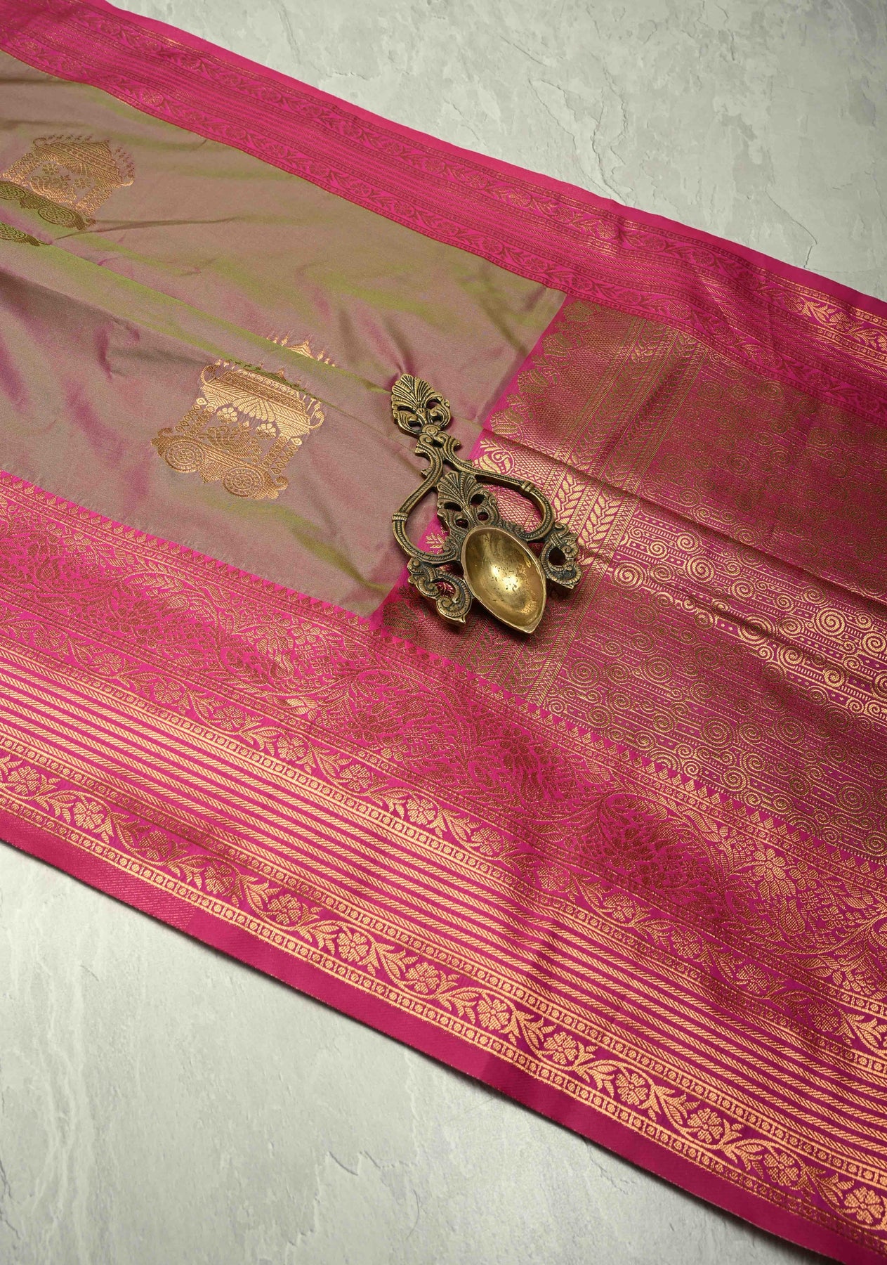 Discover the stunning color shift of this exceptional Purple-Green Dual Tone Kanchi Semi Silk Saree. The unique weave blends rich purple and deep green threads, creating an enchanting, shimmering effect that changes with the light. The body is elegantly adorned with classic South Indian Temple Chariot Buttas, intricately woven in gleaming Zari. Finished with a magnificent traditional Zari Border, this saree offers the grandeur of Kanjivaram heritage with a beautiful, comfortable drape perfect for weddings, receptions, and festivals.