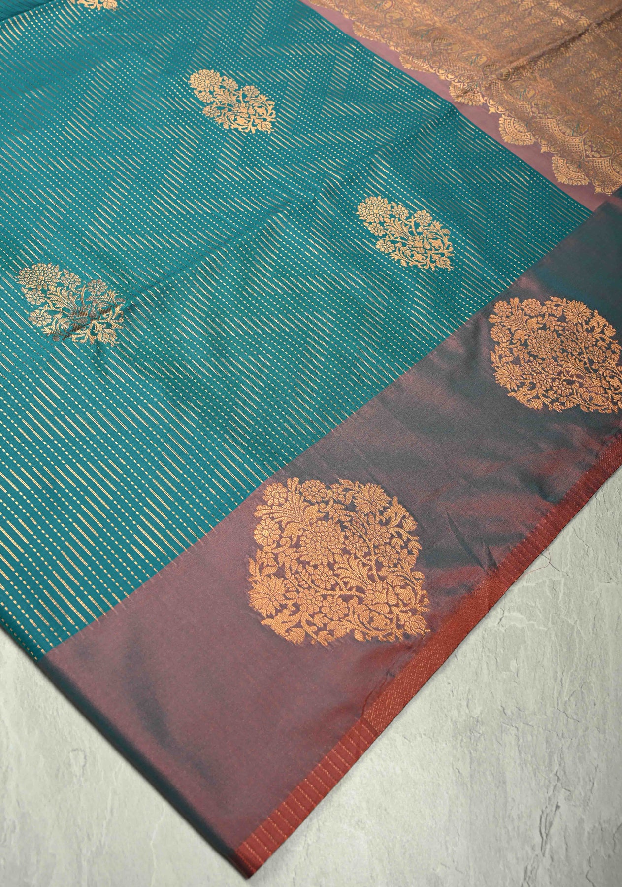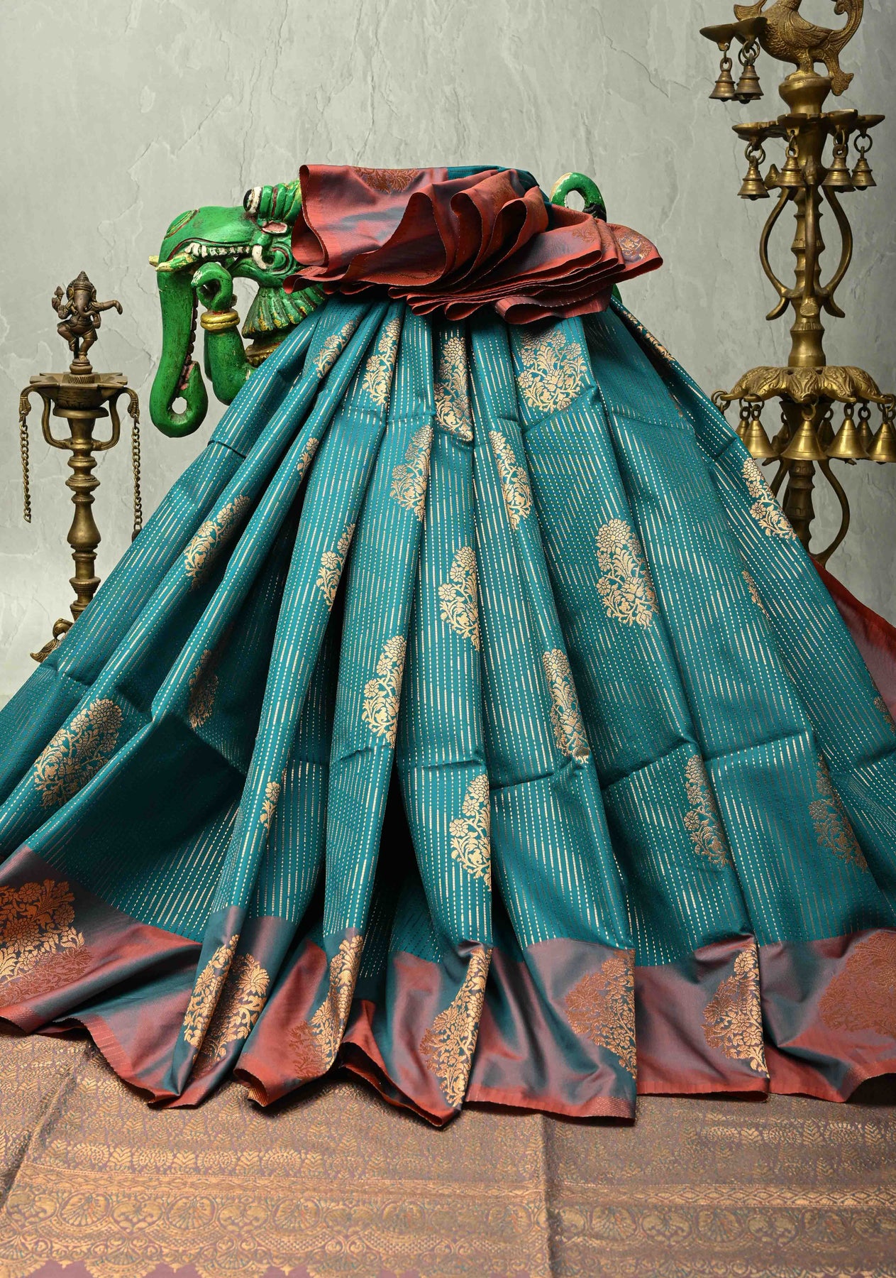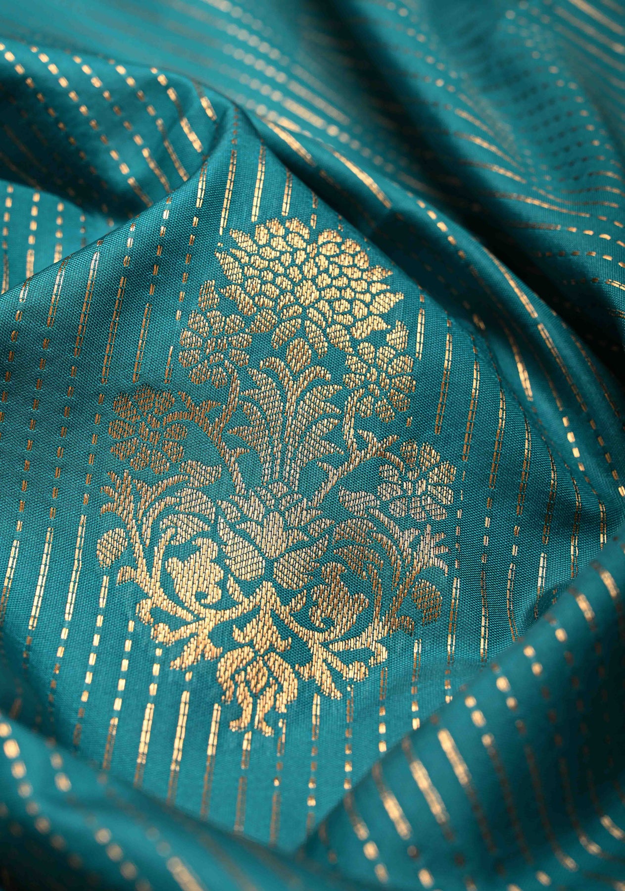 The saree features refined vertical stripe weaving, adding structure and a timeless aesthetic to the vibrant green base. Delicate zari buttas are scattered across the body, lending a subtle shimmer that enhances its traditional appeal. Completing the look is a contrast zari border, richly woven to frame the saree with a touch of grandeur and visual elegance.