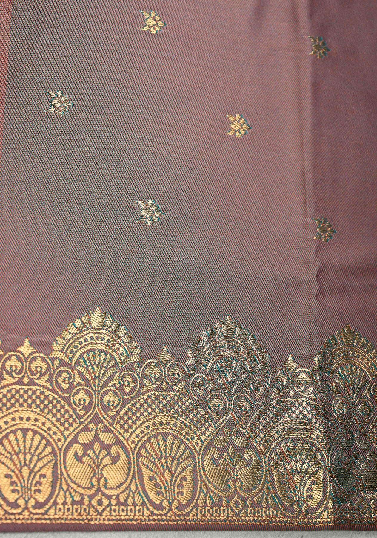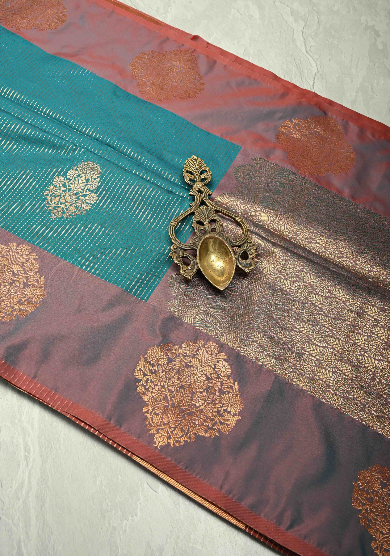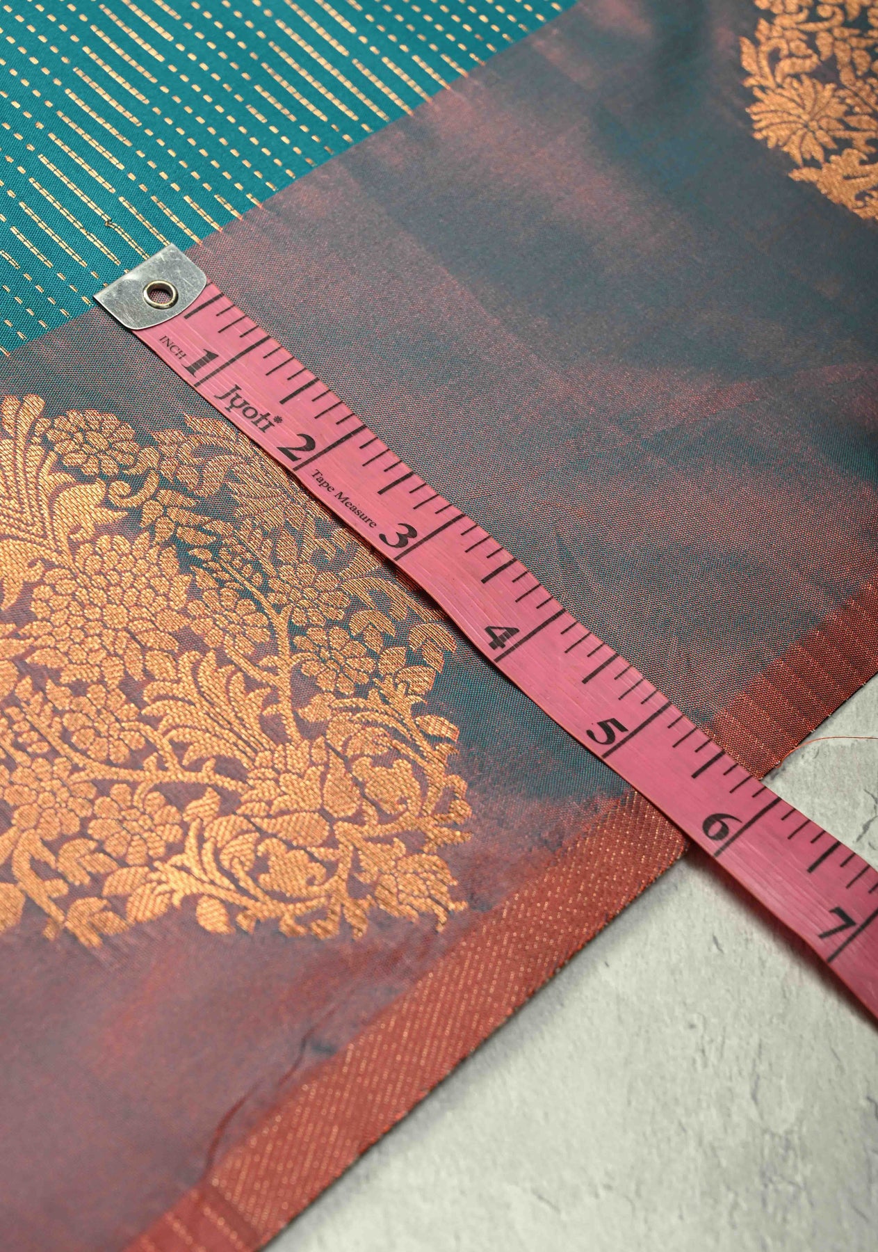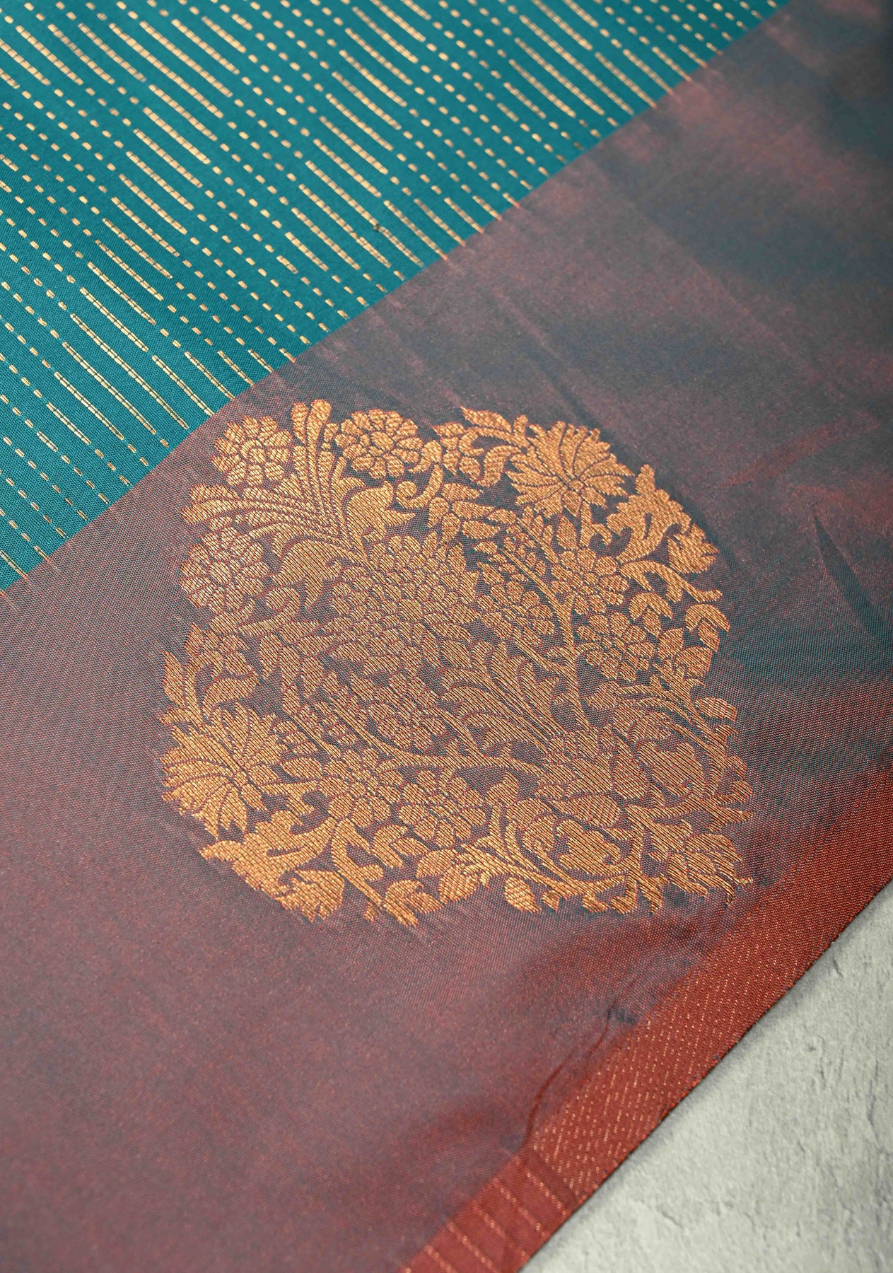 The saree features refined vertical stripe weaving, adding structure and a timeless aesthetic to the vibrant green base. Delicate zari buttas are scattered across the body, lending a subtle shimmer that enhances its traditional appeal. Completing the look is a contrast zari border, richly woven to frame the saree with a touch of grandeur and visual elegance.
