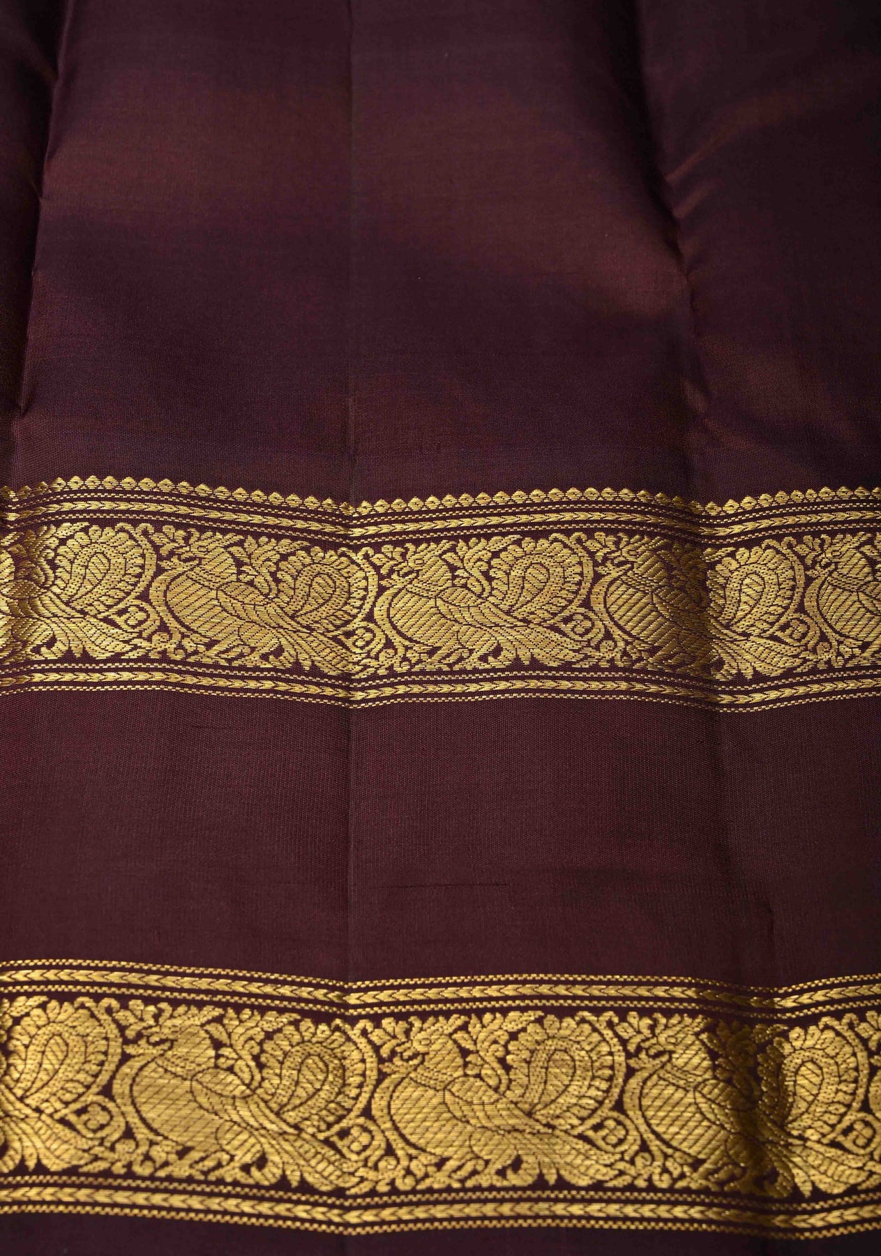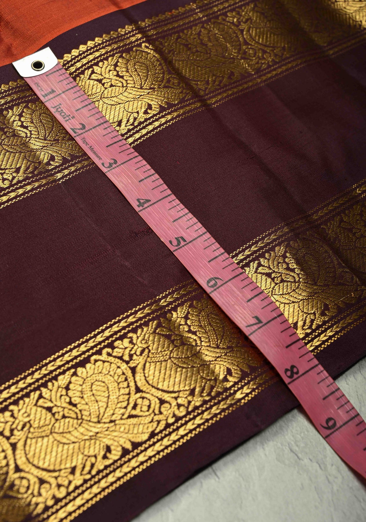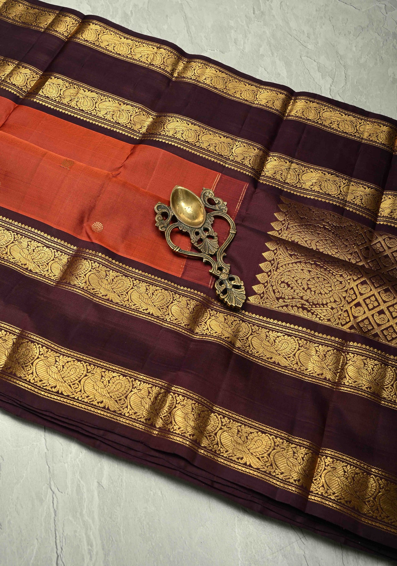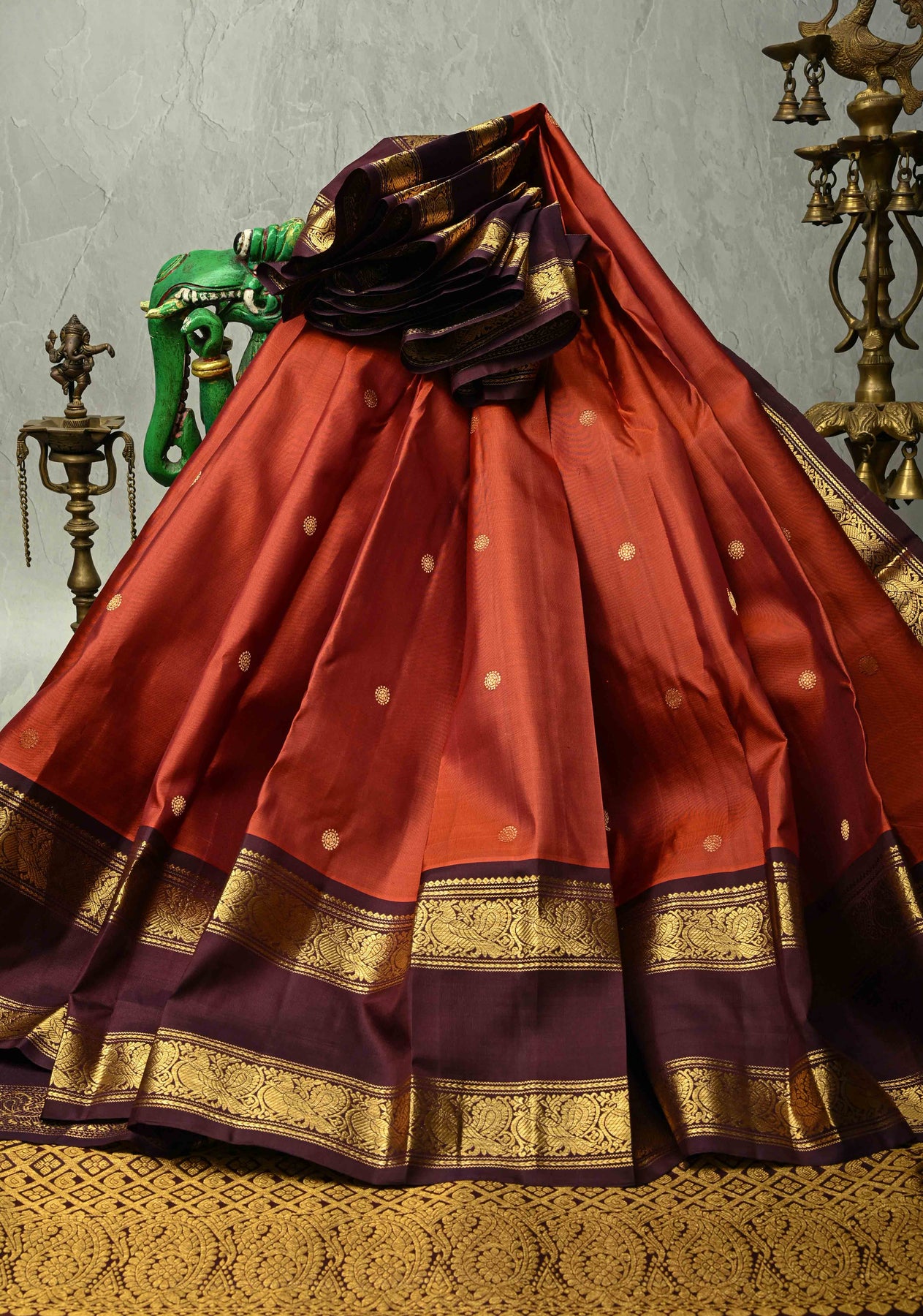 Add a touch of traditional elegance with this Rust Orange Gadwal Silk Saree. Crafted from Gadwal silk, it offers a lightweight and smooth drape with a subtle sheen. The saree features delicate zari buttas across the body, adding understated sparkle and enhancing its ethnic charm. A wide contrast zari border frames the saree beautifully, giving it a regal and festive appeal. Perfect for weddings, festivals, and cultural celebrations, this saree combines classic craftsmanship with vibrant elegance.