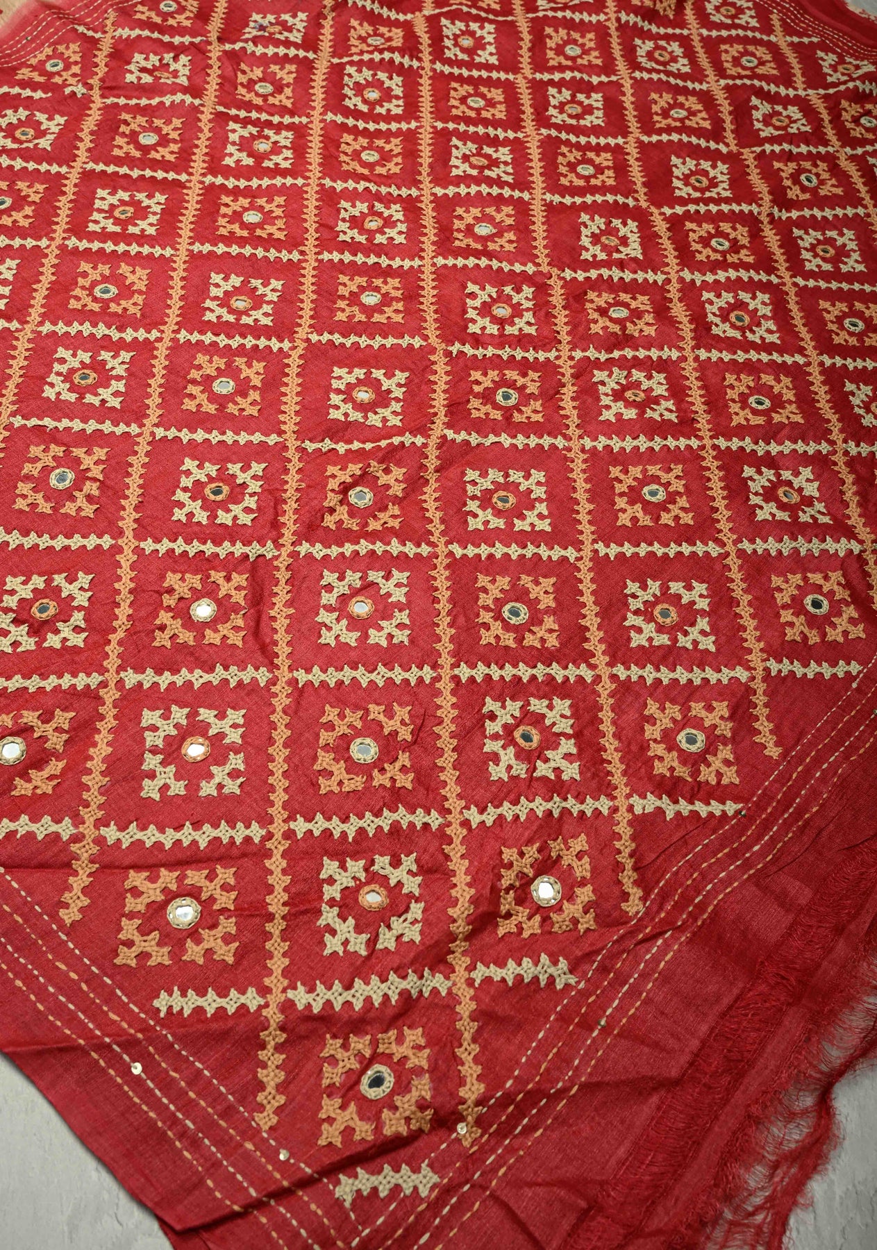 This Tan Tussar Silk Saree is a graceful fusion of modern print artistry and traditional handcraft. The naturally textured Tussar silk forms a warm tan, beautifully enhanced with soft floral digital prints that lend a contemporary, elegant charm. The highlight of the saree is its intricately embellished pallu, featuring authentic Gujarati hand embroidery paired with delicate mirror work. These handcrafted elements add sparkle, depth, and cultural richness, creating a striking contrast against the serene floral backdrop. Lightweight, luxurious, and artistically detailed, this saree is perfect for festive gatherings, cultural events, and refined special occasions.