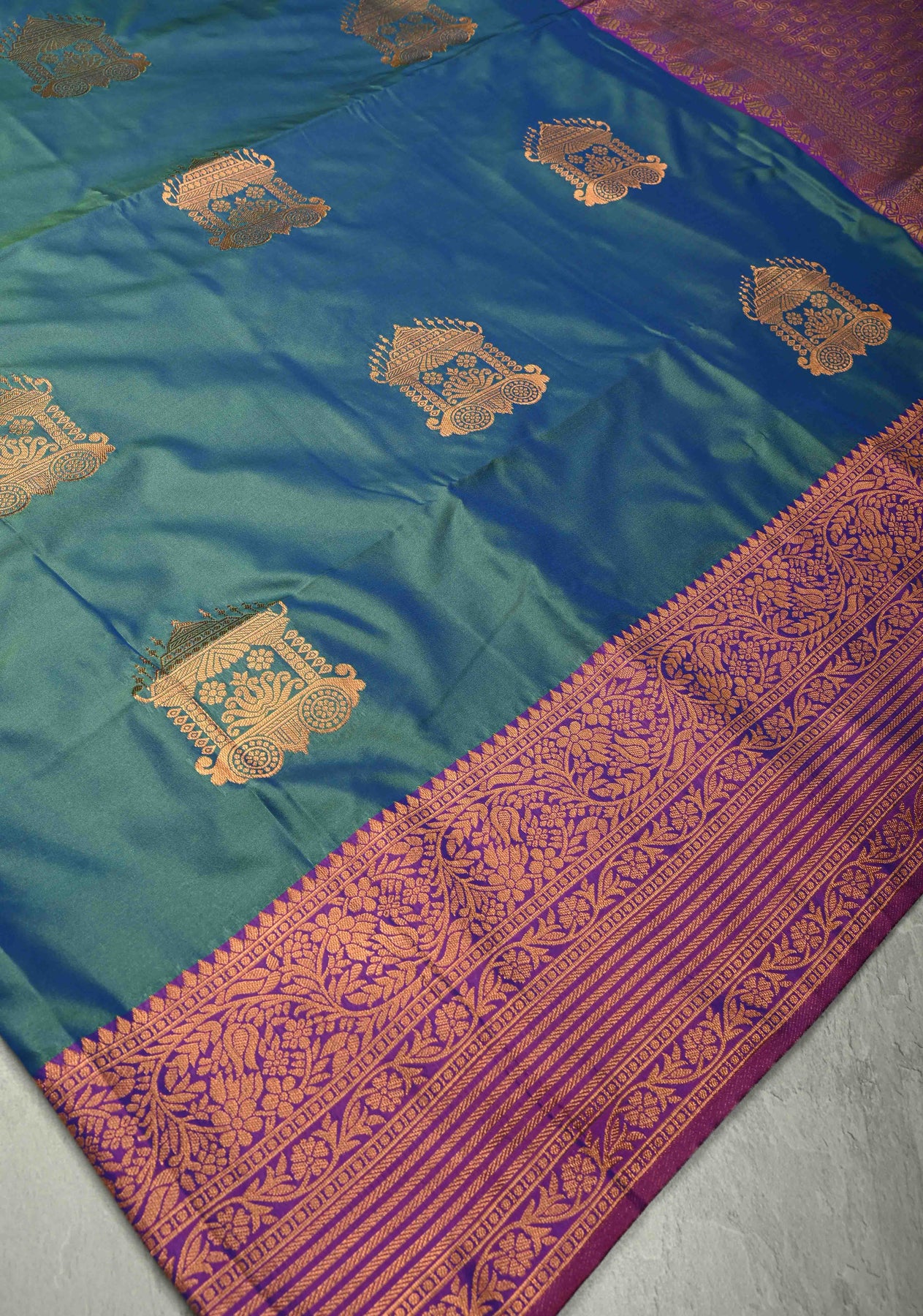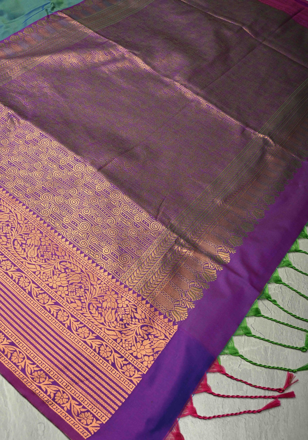 Celebrate timeless tradition with this stunning Teal Blue Dual Tone Kanchi Semi Silk Saree, where rich craftsmanship meets vibrant elegance. The dual-tone fabric gracefully shifts between deep and bright teal hues, creating a captivating shimmer that enhances its regal appeal.