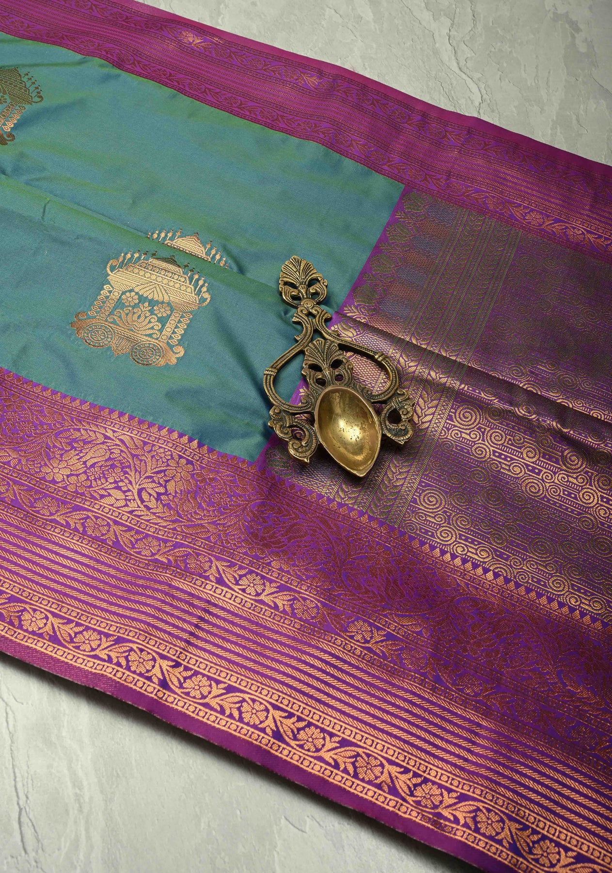 Adorned with exquisite Temple Chariot (Ratha) Zari Buttas, the saree showcases intricate motifs inspired by majestic temple processions, symbolizing cultural heritage and divine grandeur. These golden buttas add a sacred charm, perfect for festive occasions and ceremonial events.