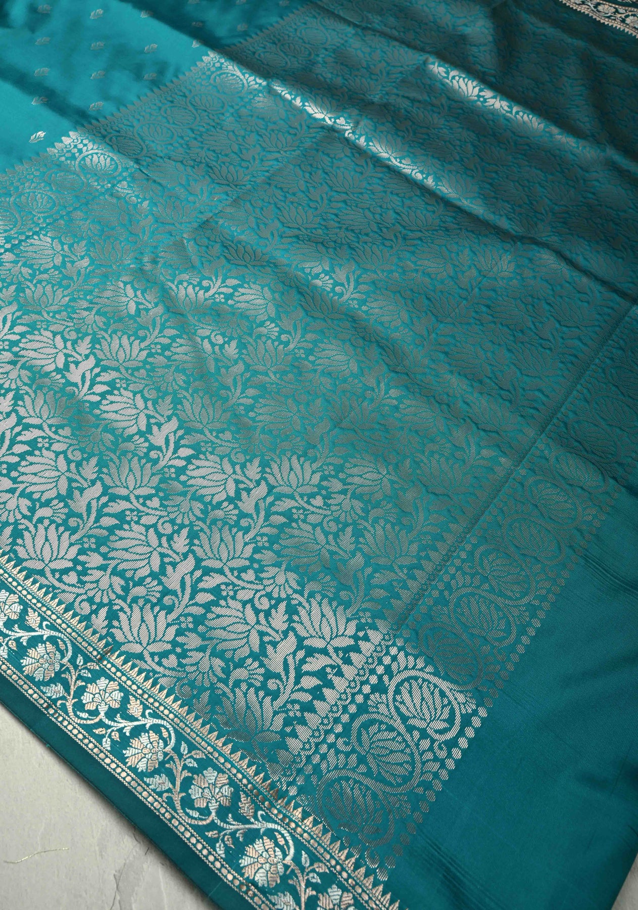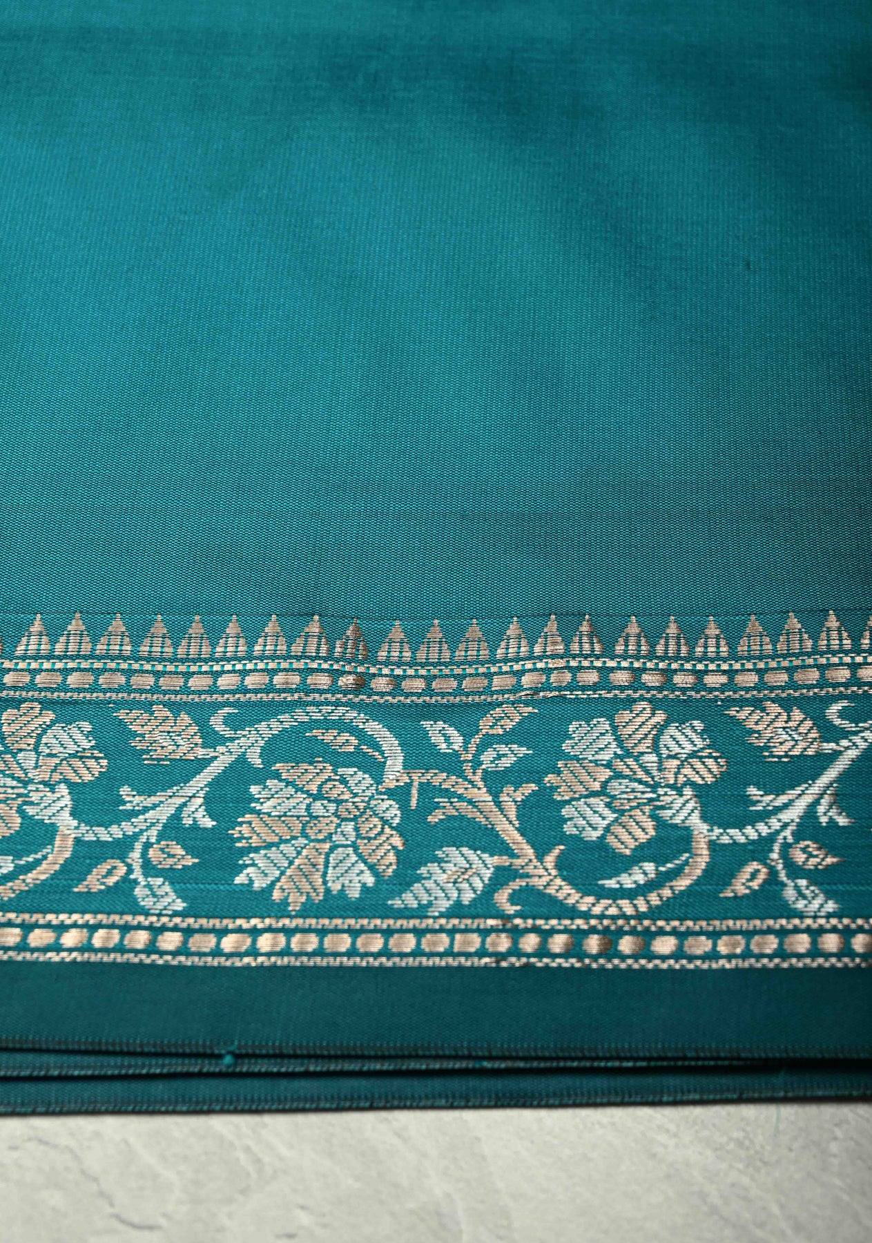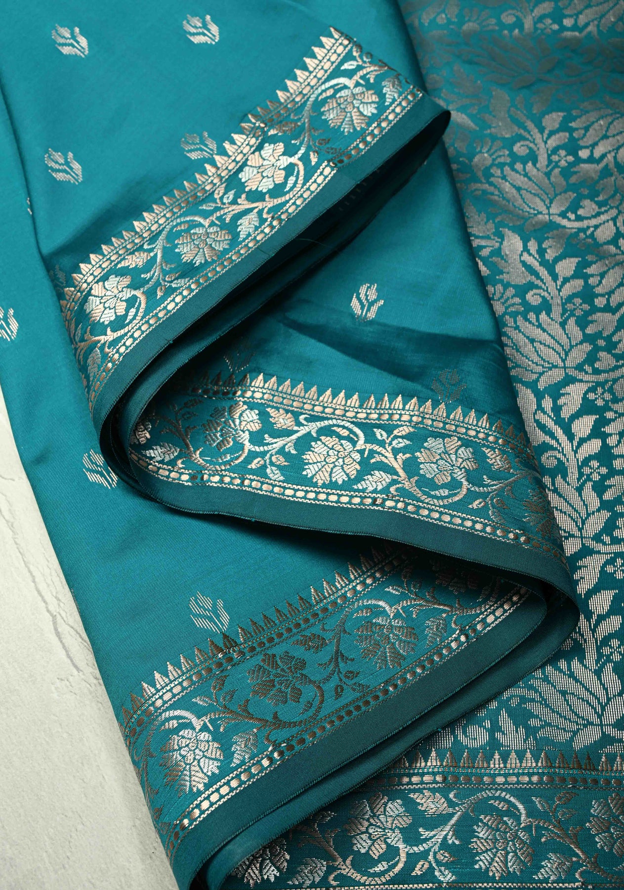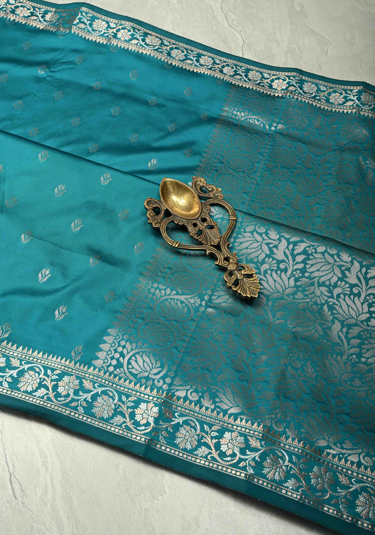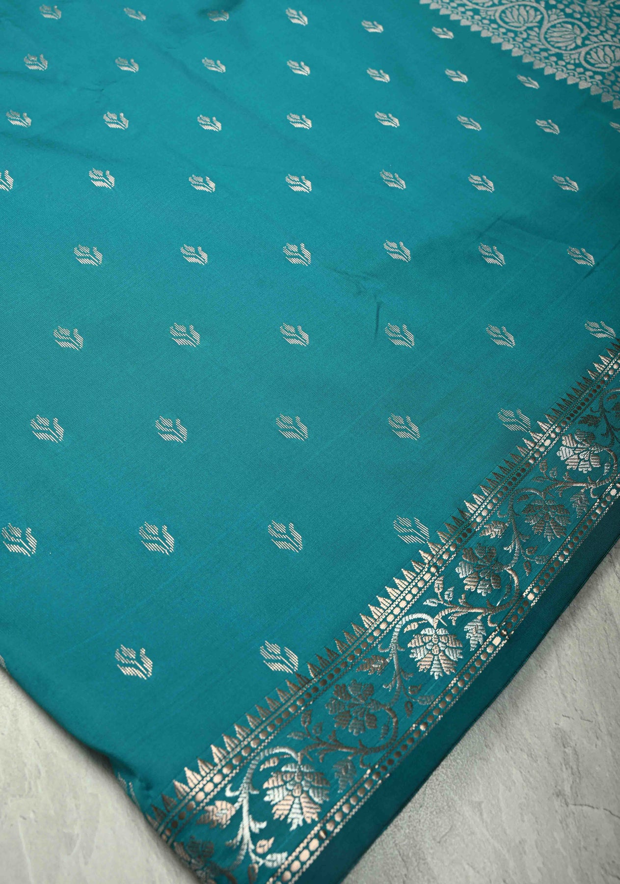 The Teal Blue Semi Silk Saree with Floral Buttas and Alfi Zari Border is a striking blend of rich color and intricate detailing, perfect for any special occasion. The teal blue hue brings a sense of sophistication, while the delicate floral buttas embroidered across the saree add a touch of timeless beauty. Made from a semi-silk fabric, the saree offers a beautiful drape that combines the sheen of silk with the comfort of lightweight material. The Alfi zari border enhances the overall design with a subtle shine, adding a traditional yet modern flair. Ideal for weddings, receptions, or festive celebrations, this saree is a versatile choice for those seeking elegance with a hint of glamour.