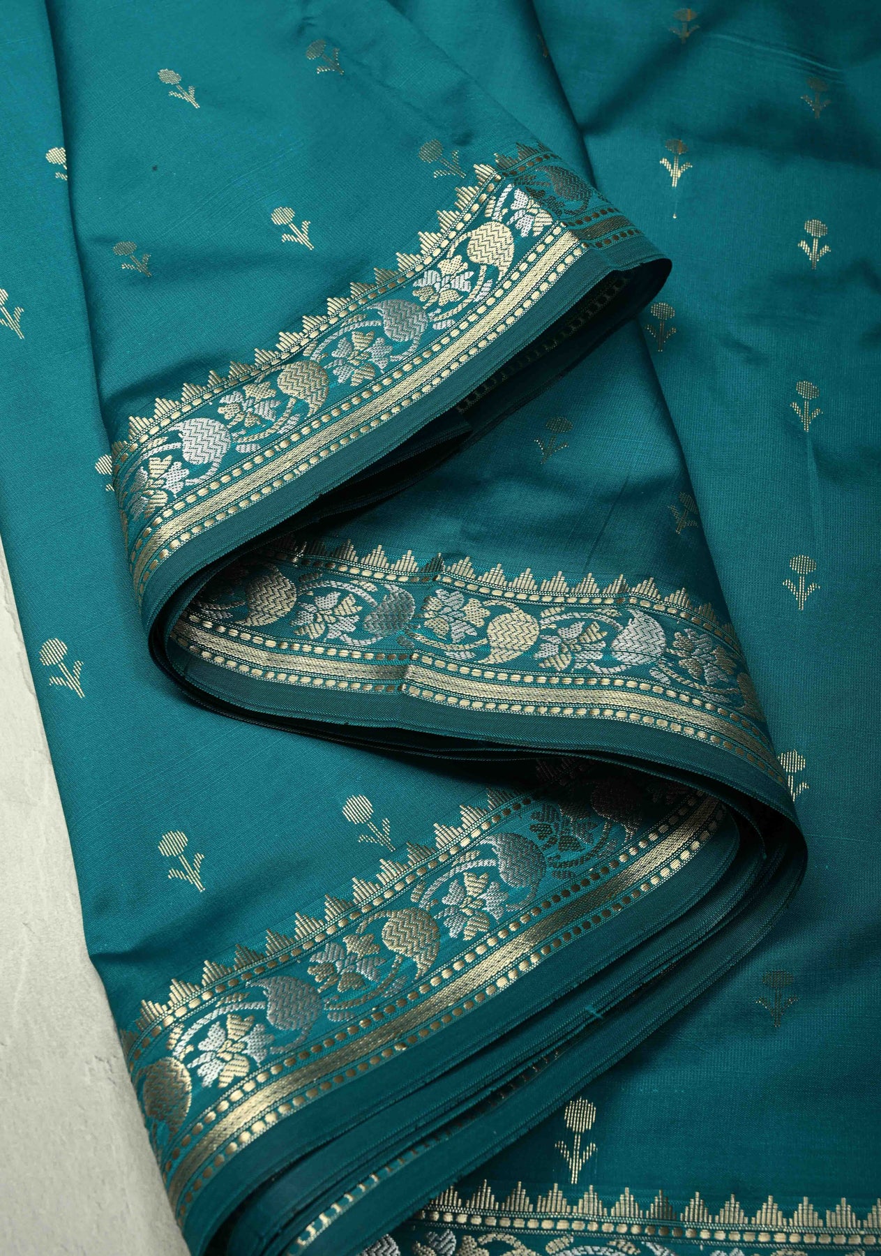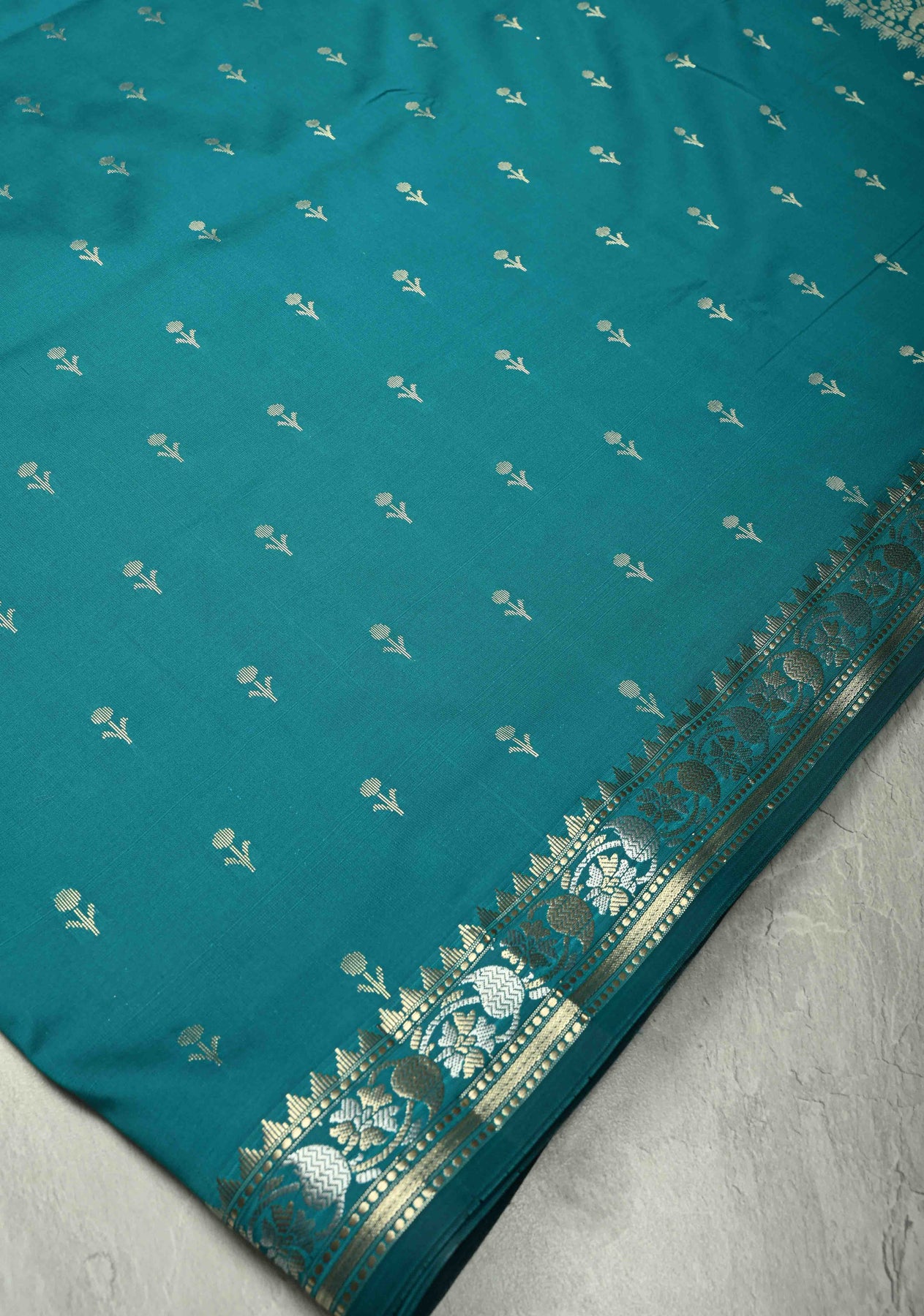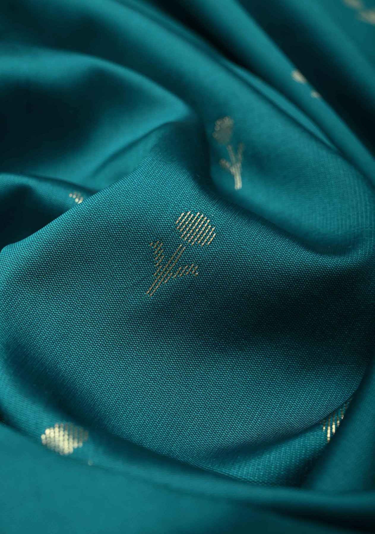 This Teal Blue Semi Silk Saree is a perfect blend of grace and tradition. Adorned with delicate Floral Zari Buttis, it adds a soft shimmer that beautifully complements the real hue. The saree is enhanced with an exquisite Meenakari Zari Border, featuring fine craftsmanship and vibrant detailing that elevate its overall elegance.