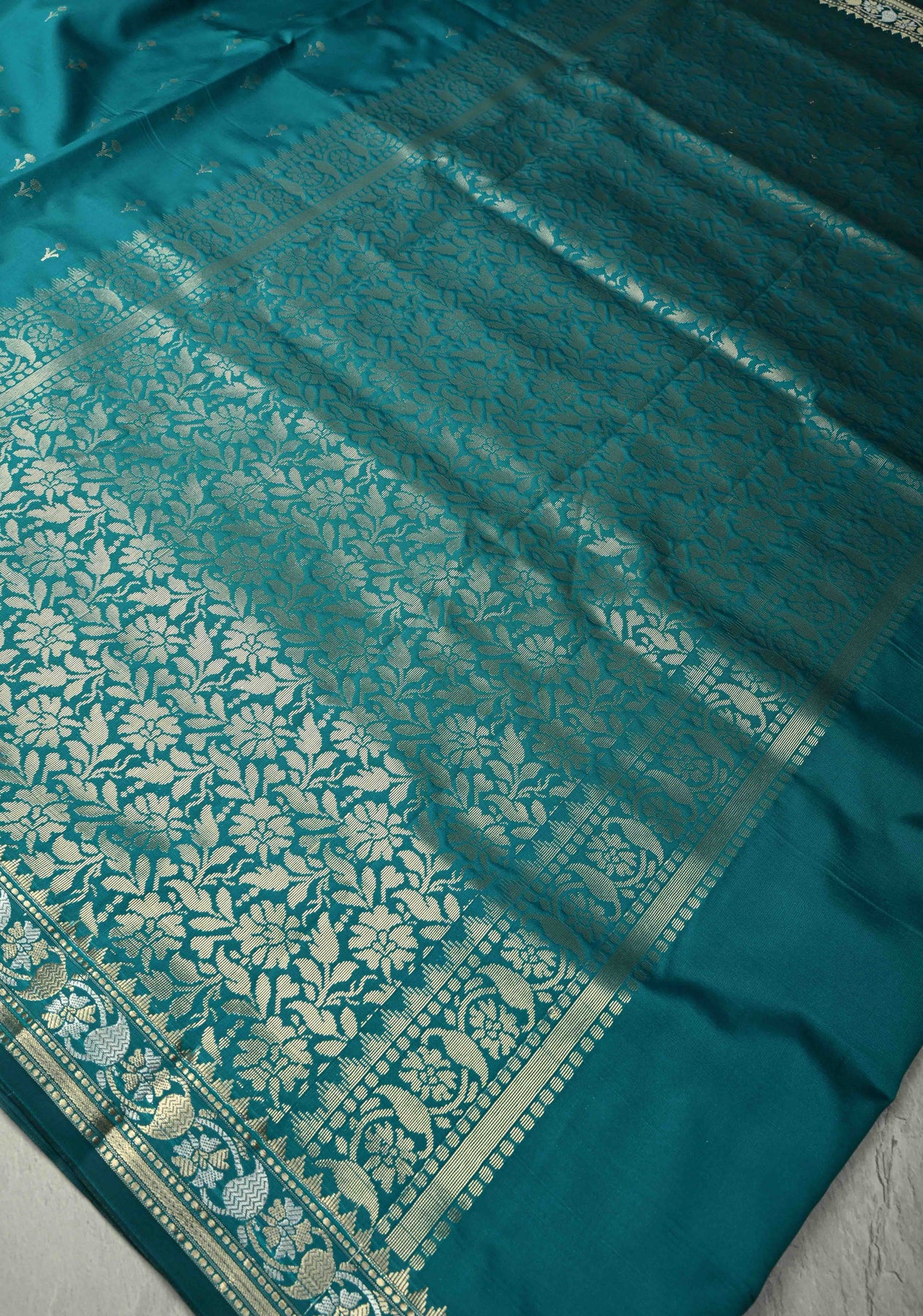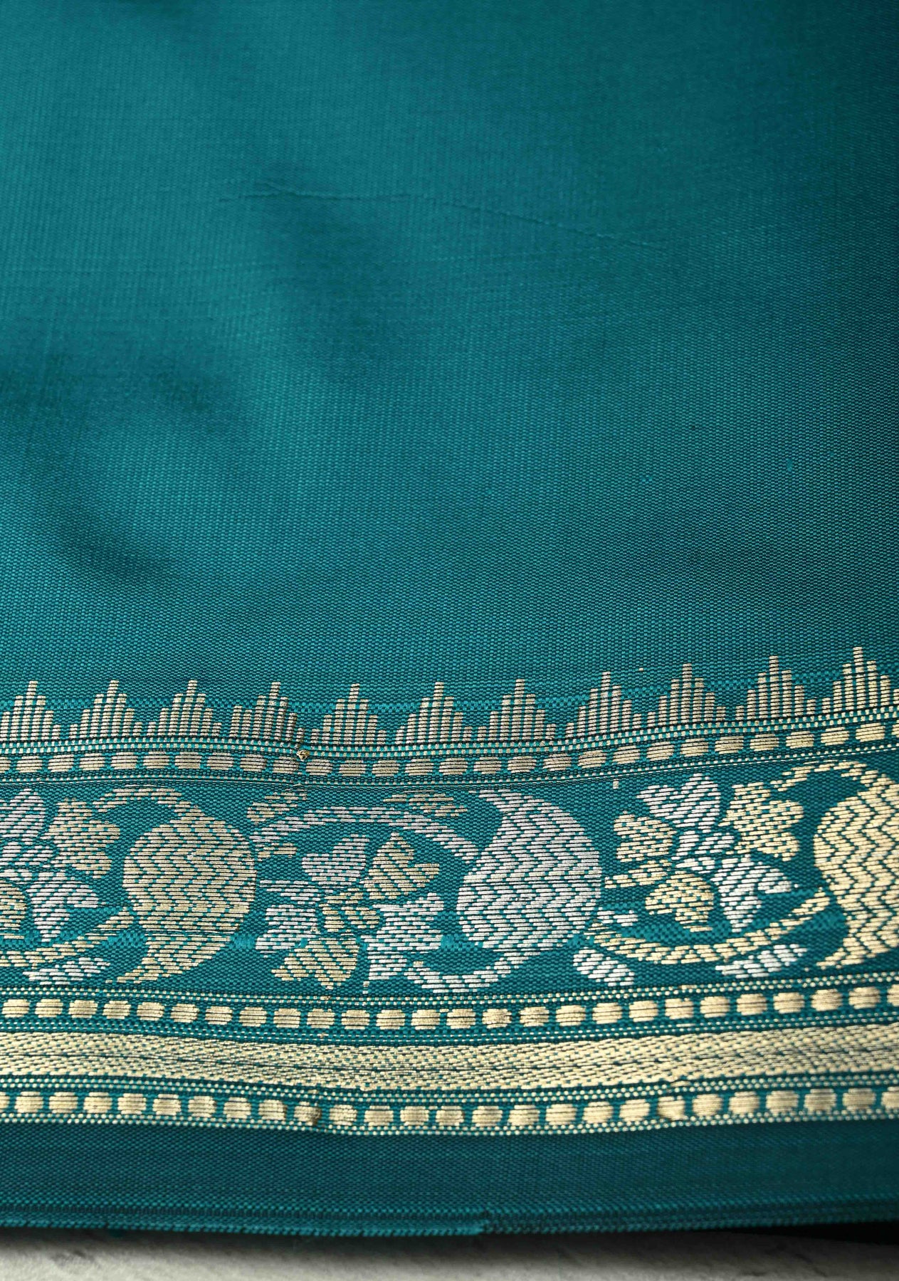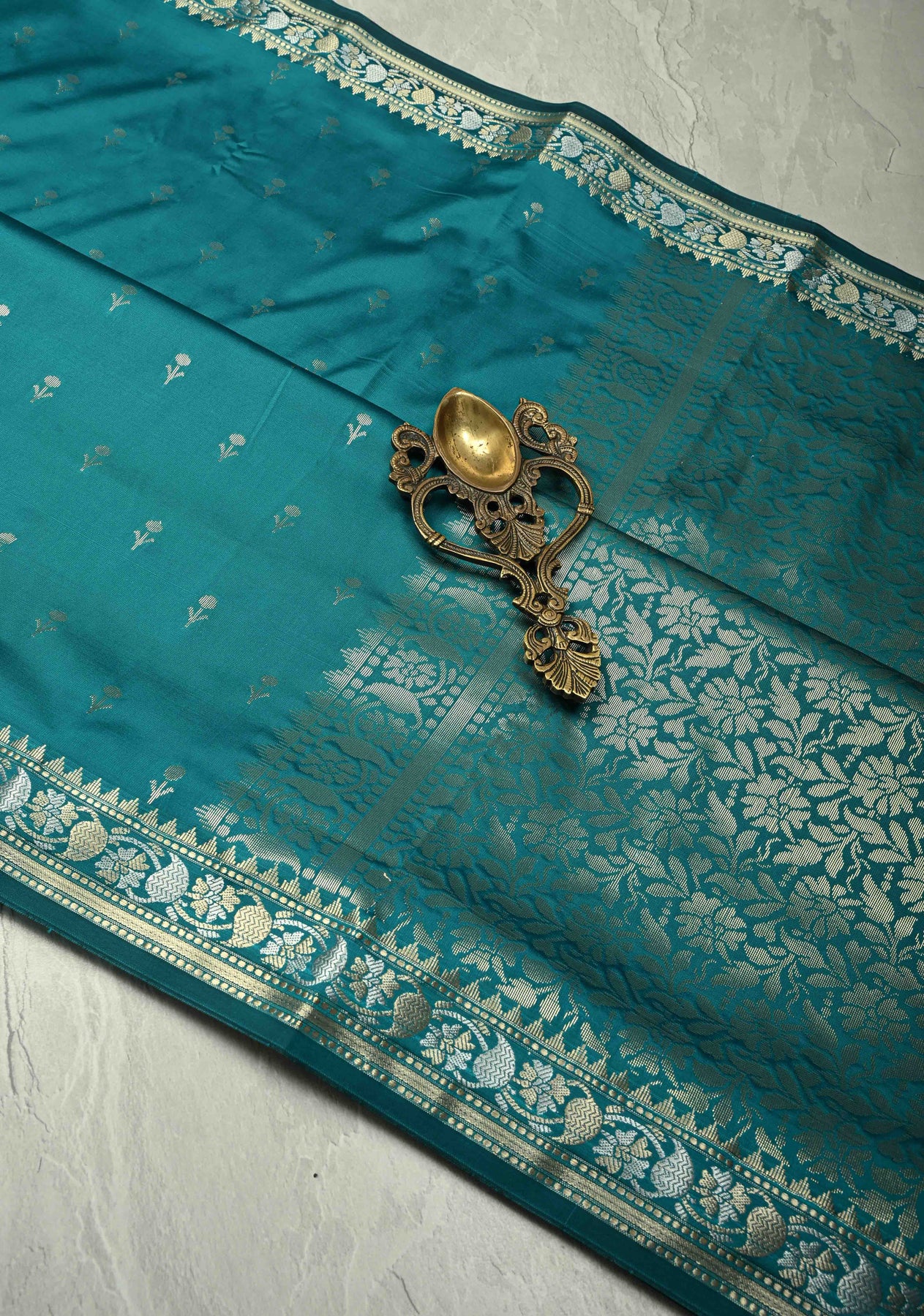 This Teal Blue Semi Silk Saree is a perfect blend of grace and tradition. Adorned with delicate Floral Zari Buttis, it adds a soft shimmer that beautifully complements the real hue. The saree is enhanced with an exquisite Meenakari Zari Border, featuring fine craftsmanship and vibrant detailing that elevate its overall elegance.