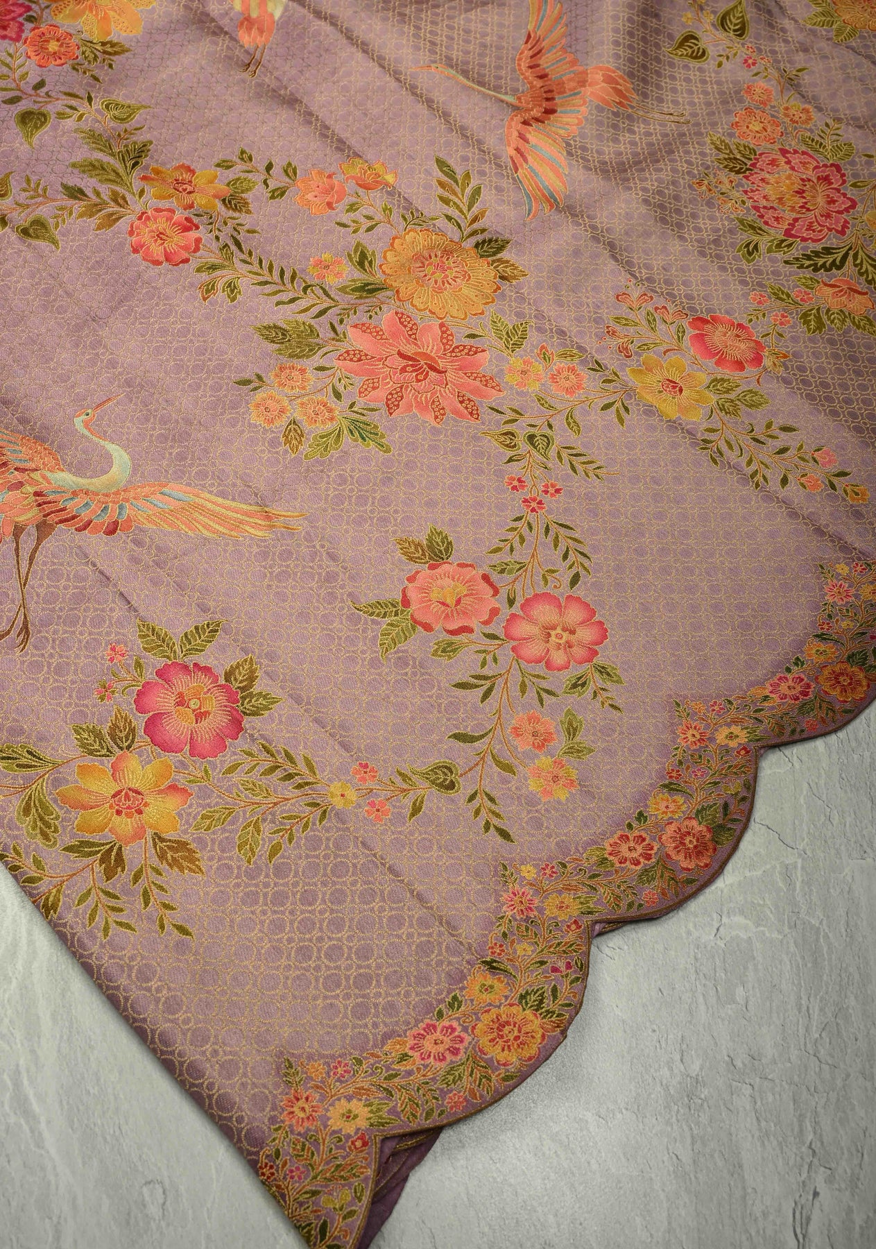 Brocade on Vegan Silk Saree in Pastel Lavender with Floral-Birds design and Scallop border , No Blouse Piece