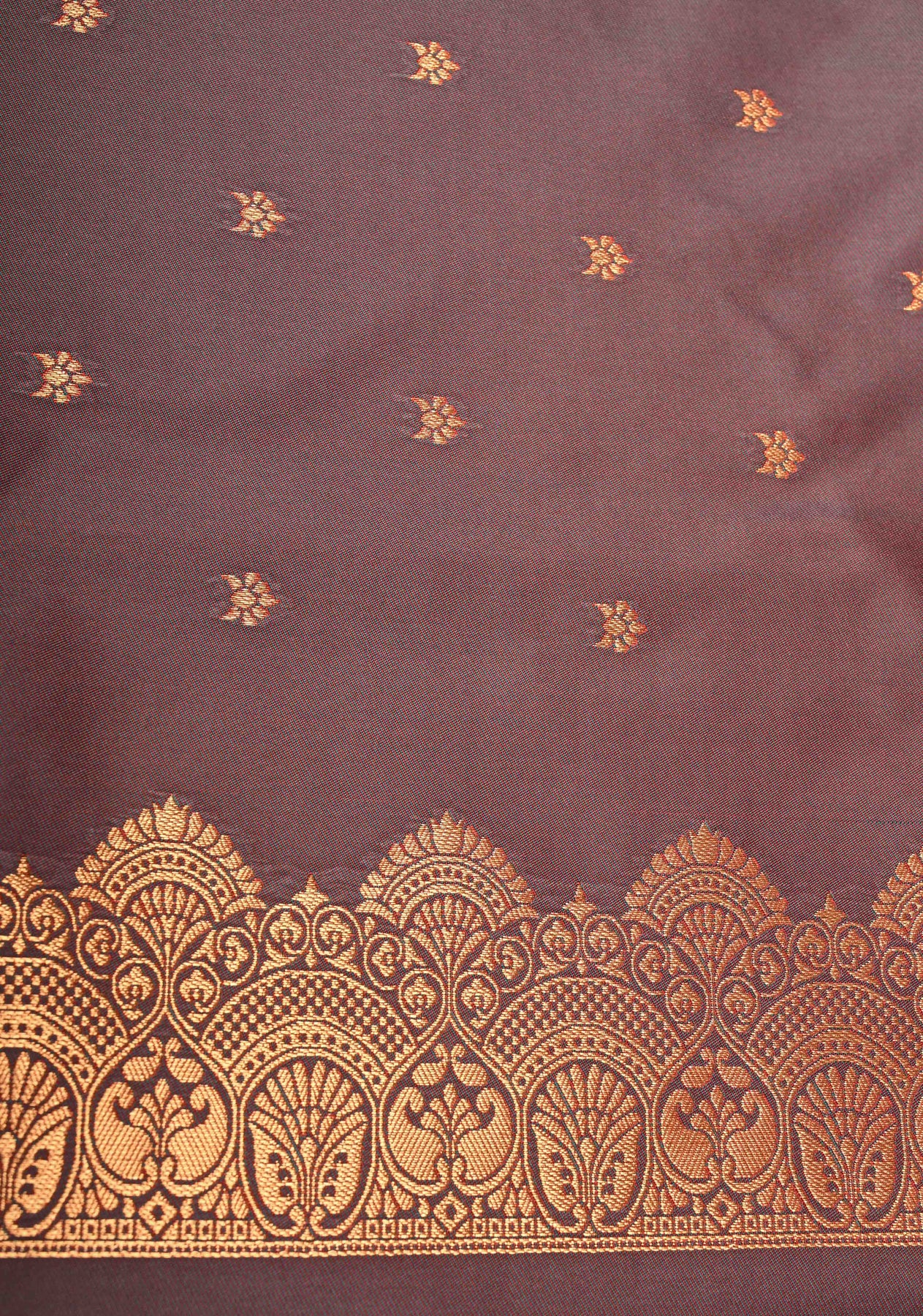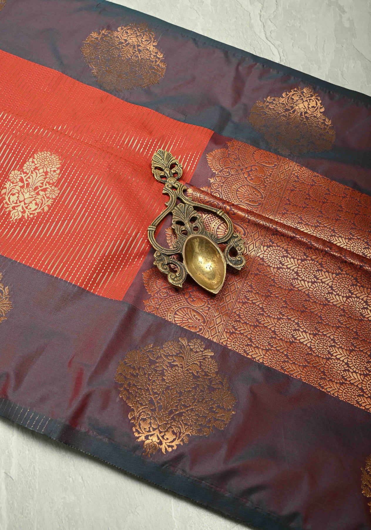 This vermilion red Kanchi semi-silk saree stands out with its striking vertical zari stripes that add shine and sophistication to the rich, vibrant base. Delicate floral buttas are woven across the body, enhancing its traditional charm with intricate detailing. The look is completed by a beautifully crafted contrast border featuring distinct motifs, showcasing the finesse of classic Kanchi weaving. Elegant, festive, and timeless, this saree is perfect for weddings, cultural events, and special celebrations.