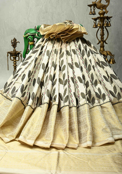 Ivory Pure Ikkat Kanjivaram Fusion Silk Saree with Floral Design and Wide Zari Border | SILK MARK CERTIFIED