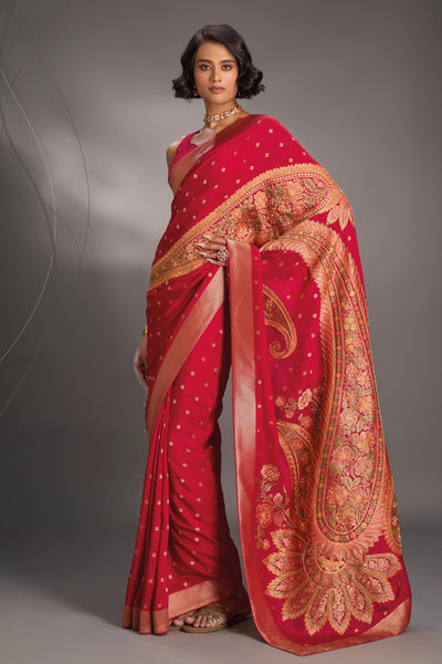 Rose Pink Meenakari on Katan Silk Saree with Zari Buttas and Sequins, Cutdana, Moti Hand work | SILK MARK CERTIFIED