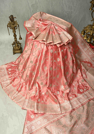 Coral Pink Banarasi Semi Mashru Silk Saree with Floral Jaal and Zari Border