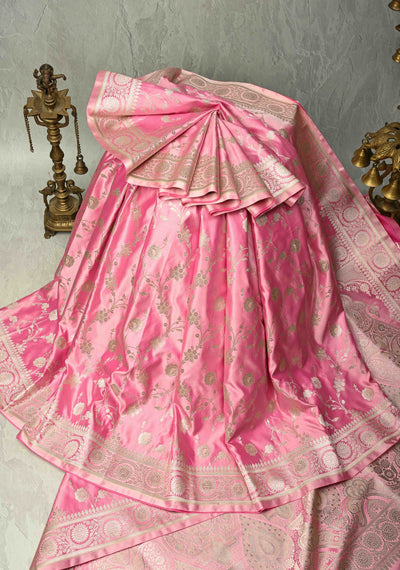 Rose Pink Banarasi Semi Mashru Silk Saree with Floral Jaal and Zari Border
