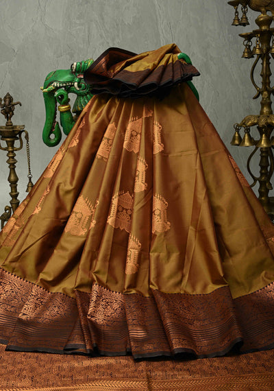 Golden Brown Dual Tone Kanchi Semi Silk Saree with Temple Chariot Zari Buttas and Contrast Wide Zari Border
