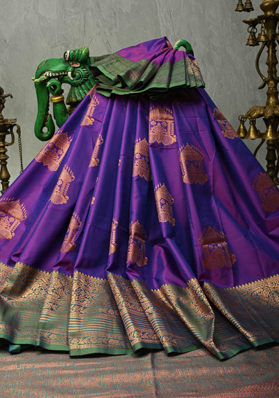 Purple-Green Dual Tone Kanchi Semi Silk Saree with Temple Chariot Zari Buttas and Zari Border