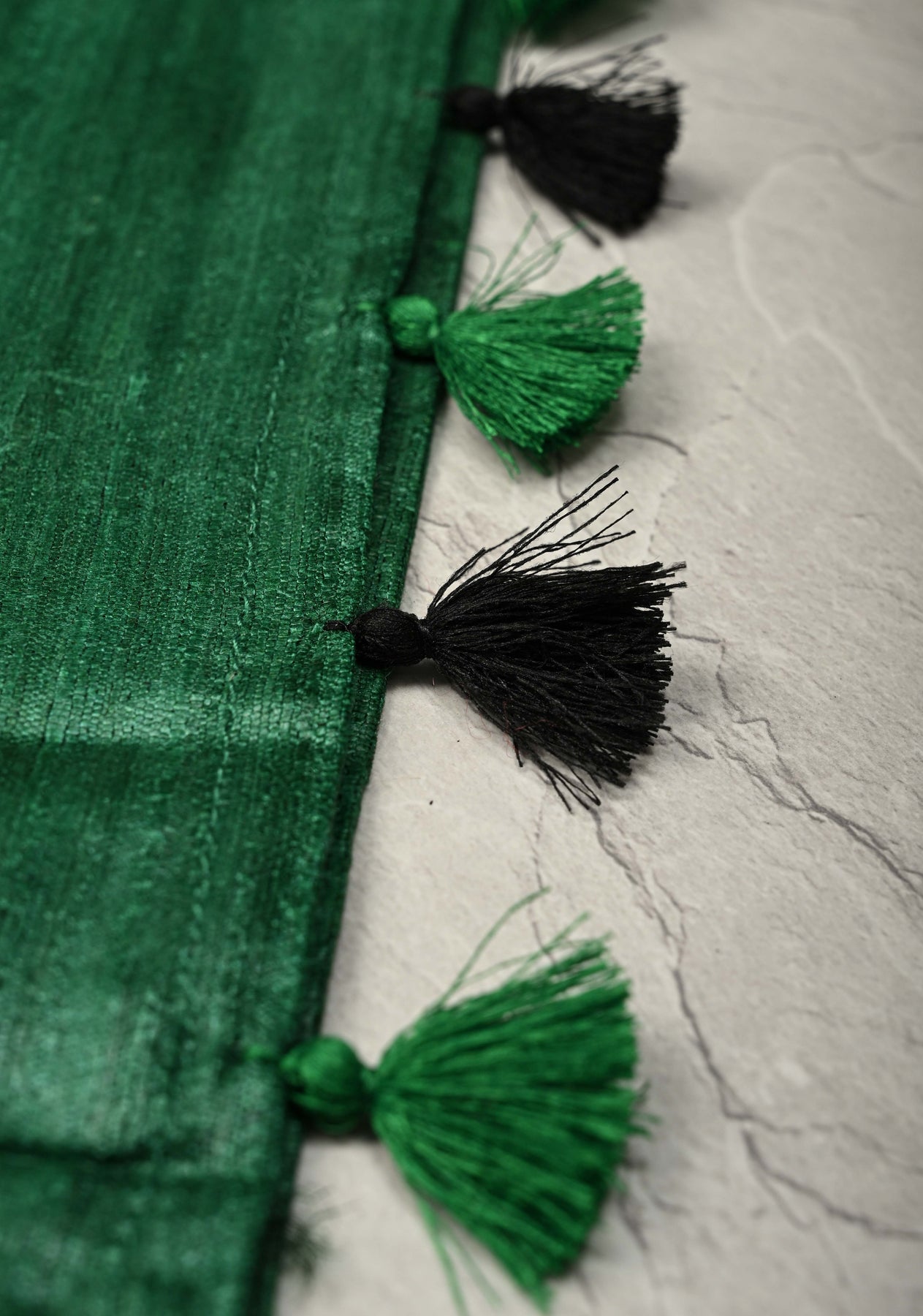 This saree is ready to wear with fall and pico done. Handmade silk tassels adorn the pallu and add more grace to it. An unstitched blouse fabric is included.