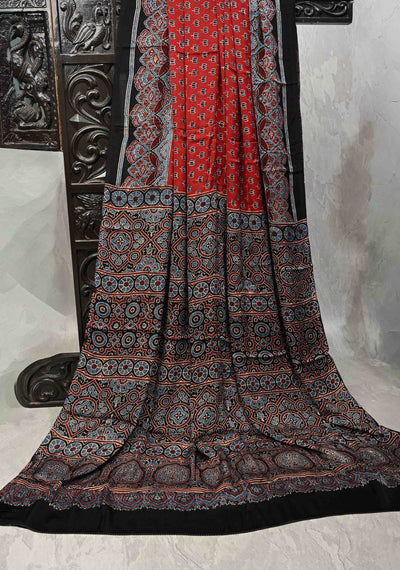 Red Ajrakh Hand Block Print on Modal Silk Saree