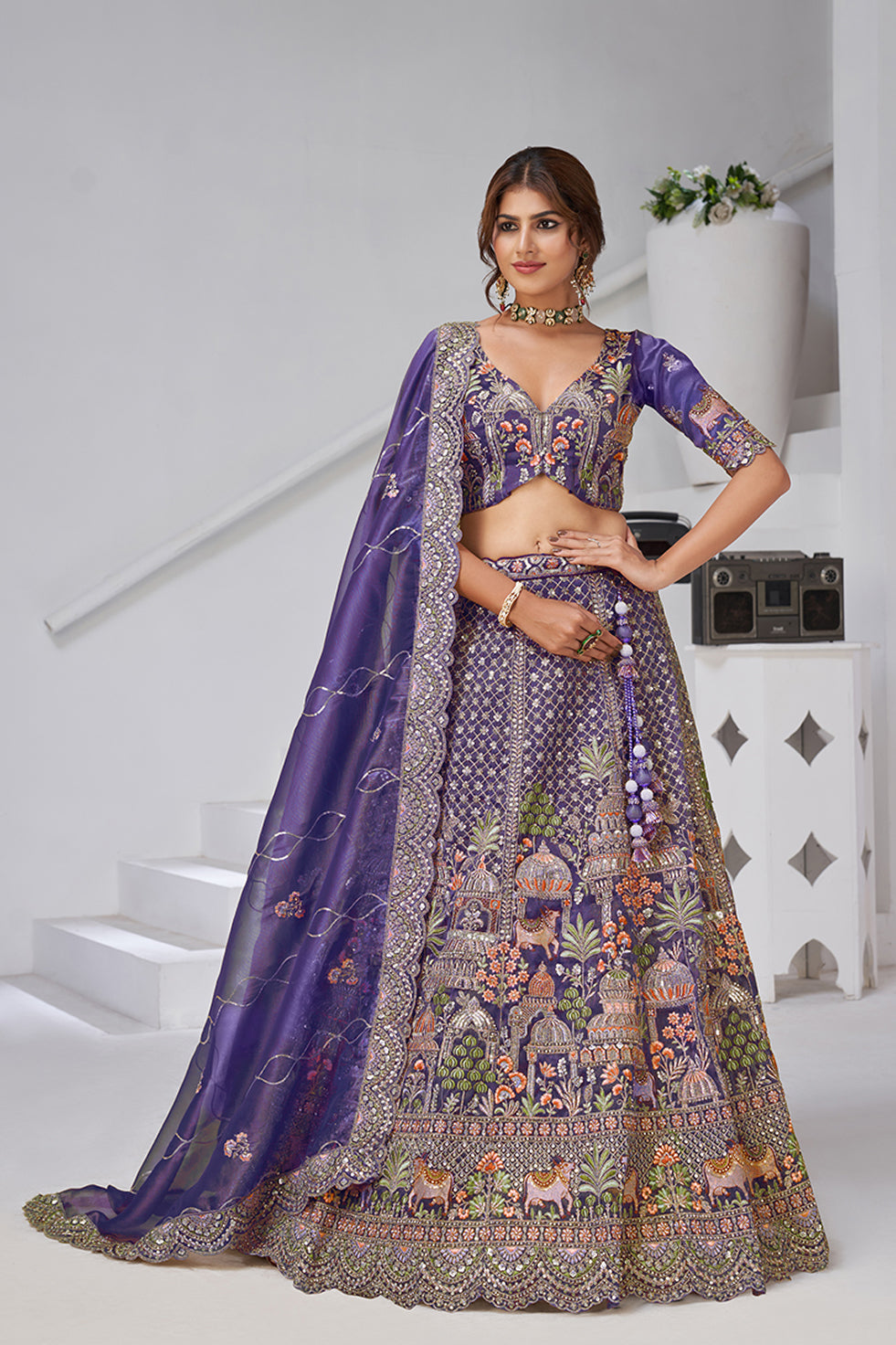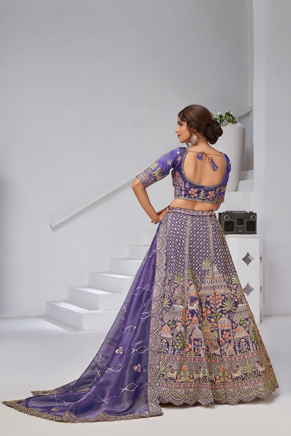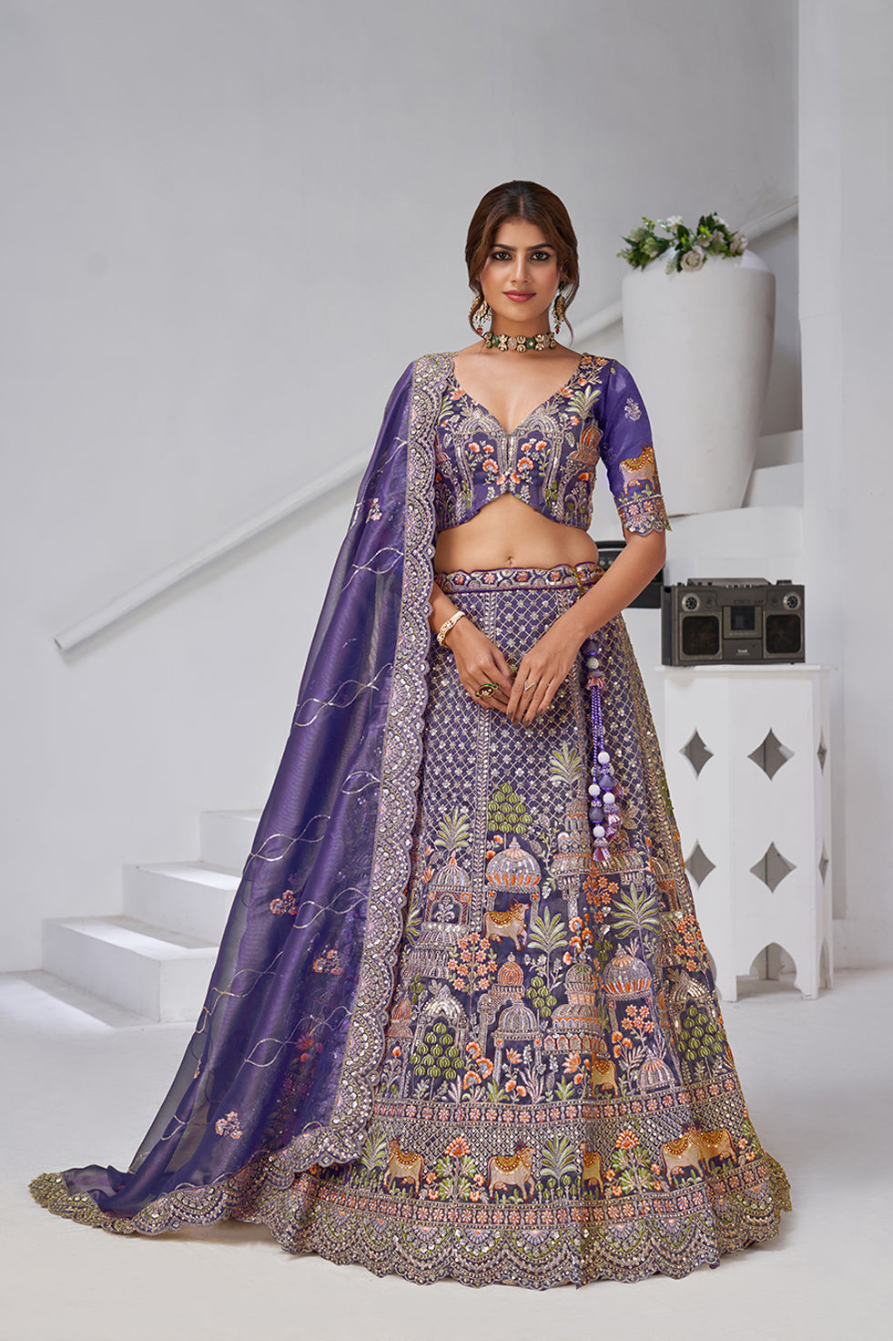 Regal and radiant, Amira embodies the essence of heritage luxury. Crafted in opulent organza tissue, this purple bridal lehenga showcases temple-inspired embroidery and sacred cow motifs that celebrate divine artistry. Detailed with resham and zari work, the ensemble reflects the grandeur of Indian tradition, making it a perfect choice for weddings steeped in culture and royal charm.