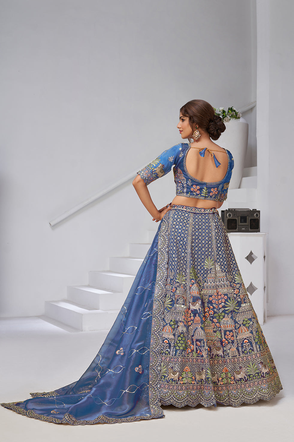 Majestic and timeless, Ishanya in teal weaves together divine motifs and intricate craftsmanship. The organza tissue base glows with resham, zari, and sequins embroidery, depicting temple art and sacred symbols of prosperity. Paired with a finely embroidered blouse and an airy dupatta, this lehenga embodies regal grace and spiritual elegance
