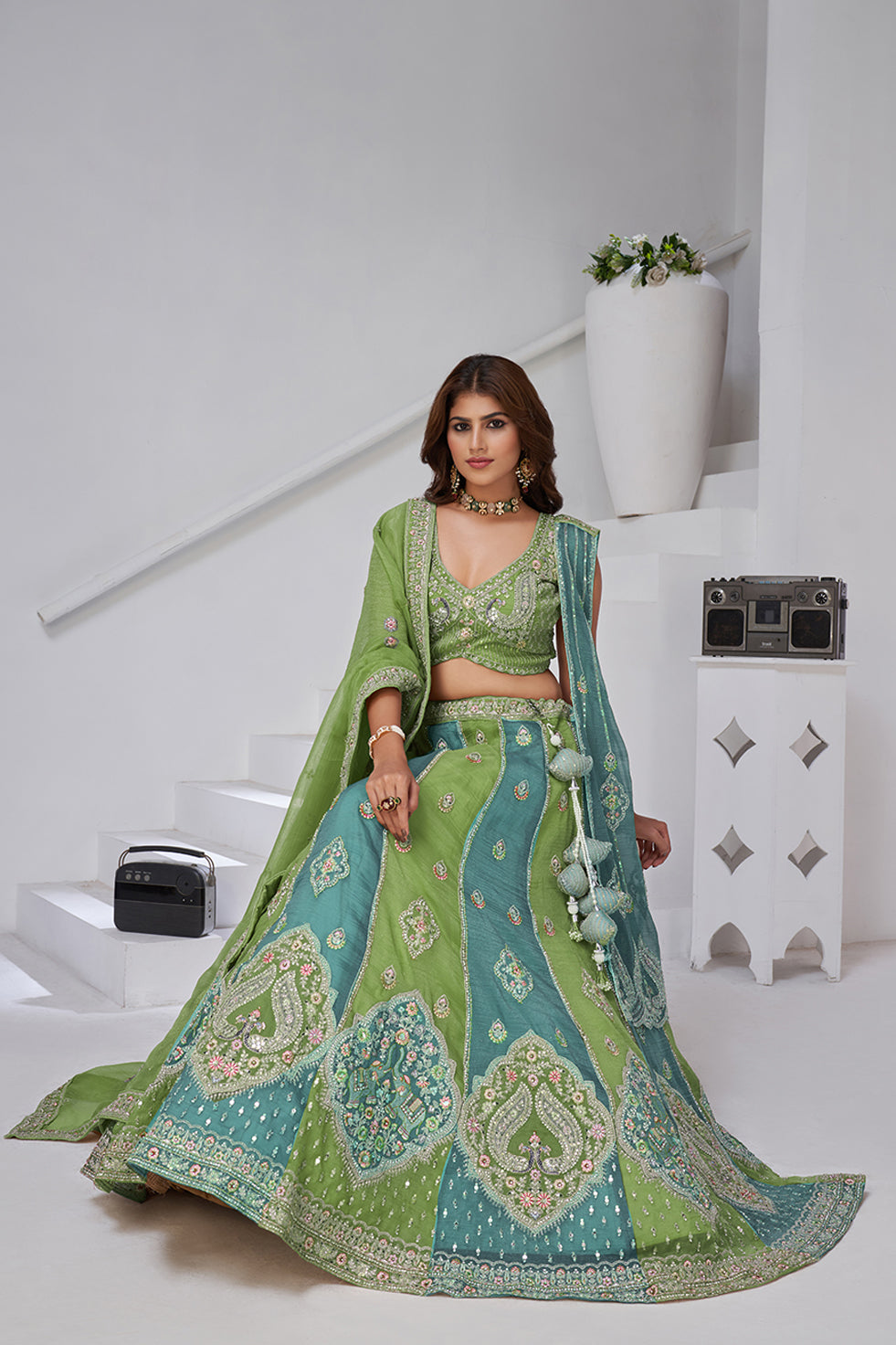 Samira captures the magic of oceanic hues with a stunning interplay of blue and green kalis. The luxurious georgette tissue fabric flows gracefully, while detailed embroidery and double dupattas elevate its grandeur. Designed for weddings, sangeet nights, and special occasions, this lehenga blends traditional artistry with a serene, contemporary sophistication.