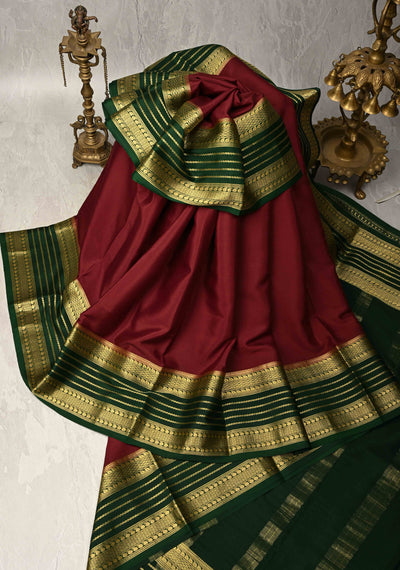 Garnet Mysore Silk Saree with Contrast Zari Borders in KSIC Grade Thickness | SILK MARK CERTIFIED