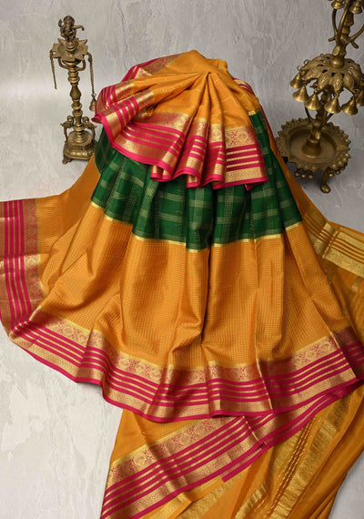 Stunning 3 Collor Mustard Yellow -Green Mysore Silk Saree with Zari Checks and Contrast Zari Borders in KSIC Grade Thickness | SILK MARK CERTIFIED