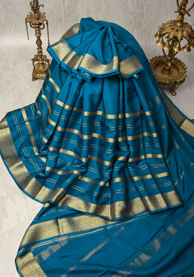 Bluish Cyan Pure Mysore Silk Saree with Zari Stripes on Royal Blue and Zari Border in KSIC Grade Thickness | SILK MARK CERTIFIED