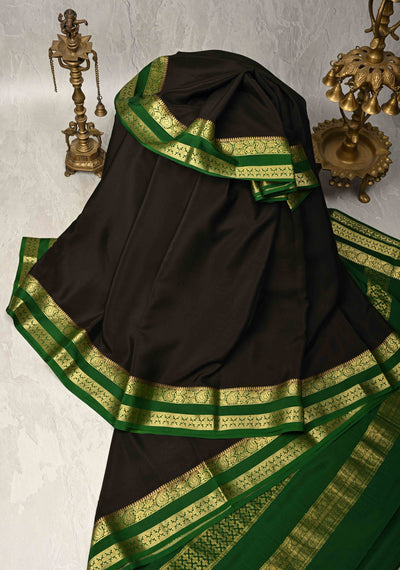 Brownish Black Mysore Silk Saree with Contrast Rettaipet Zari Borders in KSIC Grade Thickness | SILK MARK CERTIFIED