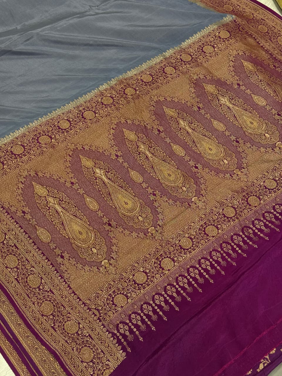 This Gray Pure Mysore Crepe Silk Saree is a sophisticated choice that beautifully balances understated elegance with traditional charm. Woven from Mysore crepe silk, the saree boasts a smooth, lustrous texture that drapes effortlessly. The subtle gray shade is enhanced by a striking contrast zari border and pallu, which add a touch of grandeur and refined detailing. Perfect for formal occasions, weddings, and festive events, this saree offers a timeless look that exudes grace and poise.