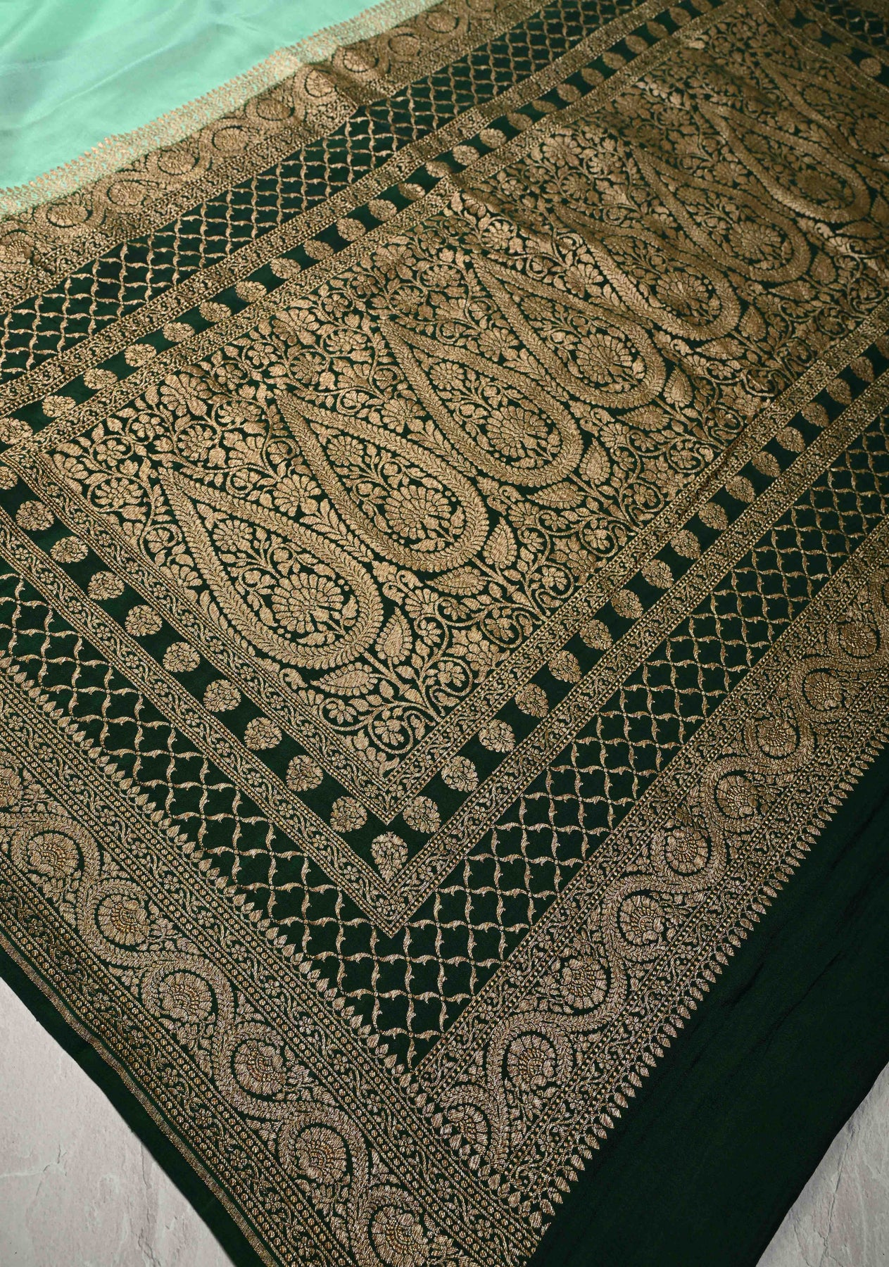 This exquisite Mint Green Mysore Crepe Silk Saree is a graceful blend of tradition and elegance. Crafted from crepe silk, the saree features the signature softness and fluid drape Mysore silks are known for. The serene mint green hue is beautifully complemented by intricately woven Koniya motifs — traditional corner designs that add a touch of cultural richness and timeless charm. A striking contrast zari border frames the saree, lending a regal edge with its shimmering gold detailing. Perfect for festive occasions, weddings, or celebrations, this saree combines classic craftsmanship with contemporary appeal, making it a sophisticated addition to any wardrobe
